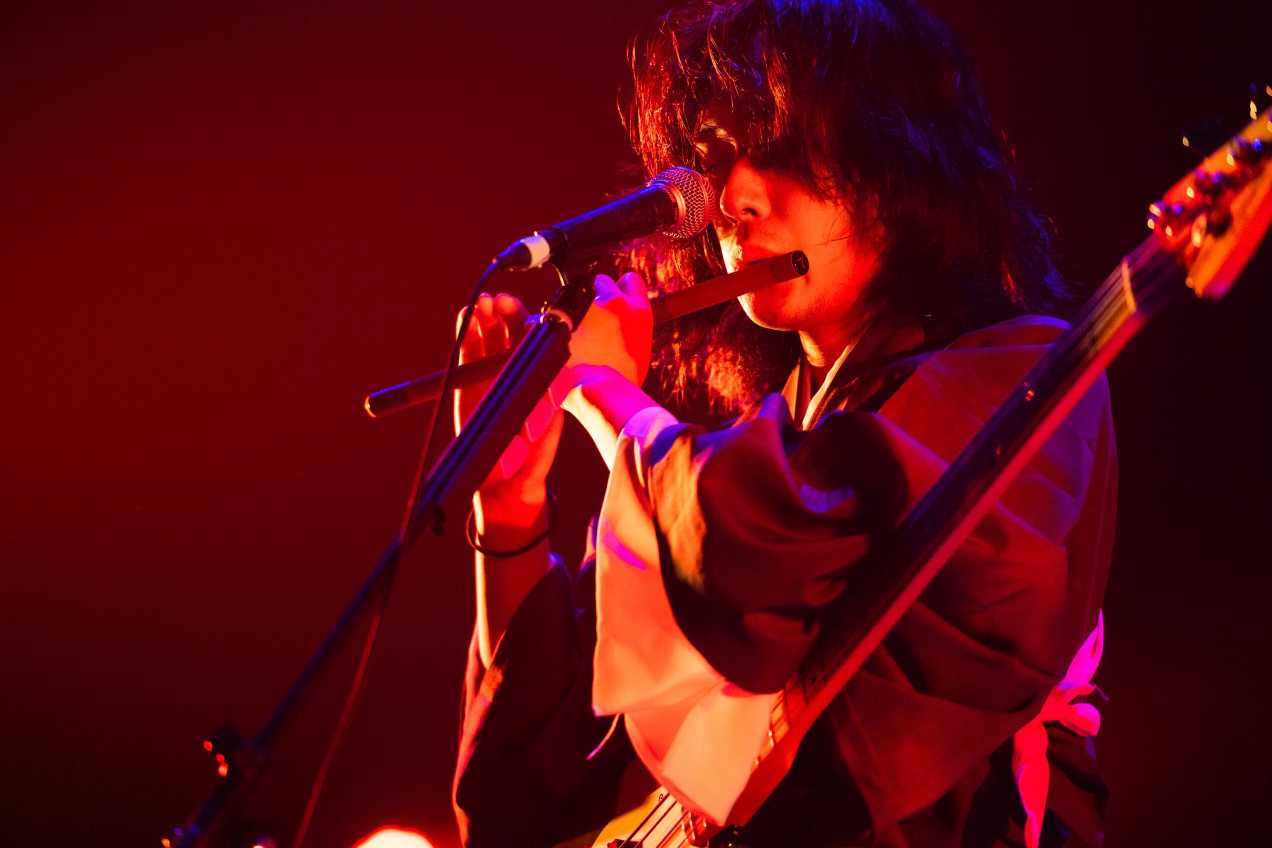 わずか結成半年だというめっちゃ美人がトップバッター!バンドに歴なんて関係ない!とんでもなく仕上がりまくりの演奏に、会場にいた人全員がたまらず「めっちゃヤバイ……。」と息を飲んだはず。何がヤバイって圧倒的情報量の多さ!手始めに友達とノリで作っちゃった、みたいなゆるさがおしゃれなW.H.A.Tを披露しサイケなムードで会場の空気を掌握。なるほどこのテイストか!なんて思っていたら叙情的なキーボードが歌うバラード曲miss youに一変。その時点で引き出しの多さを予感、そして3曲目の「まれびと」でその予感は確信に。和太鼓が登場し、響いたのは祭囃子。Vo.久場が物々しい怪談のような口上を述べ、Ba.富沢は浴衣姿で篠笛を吹く……その様はまるで日本の伝統芸能のよう。ギター無し編成のためキーボードがメロディラインを担う多彩な音もバンドの屋台骨。めっちゃ美人はトップバッターのプレッシャーも跳ね除け、見事グランプリに!