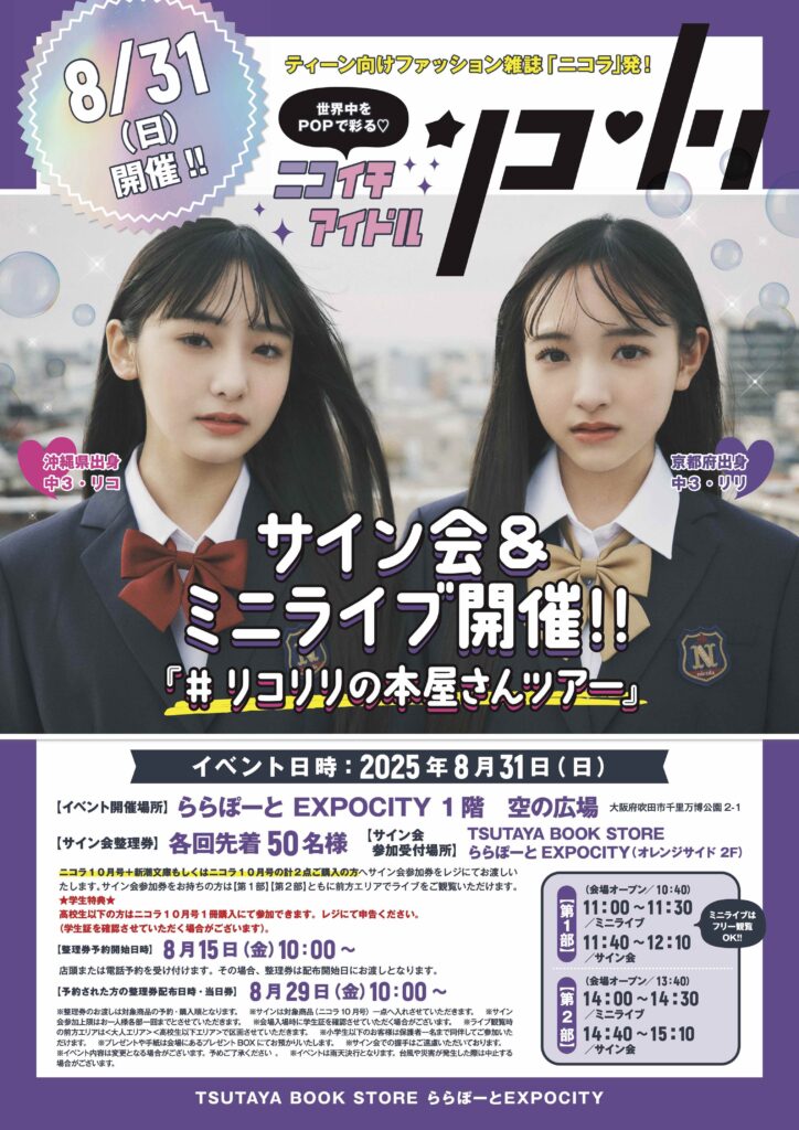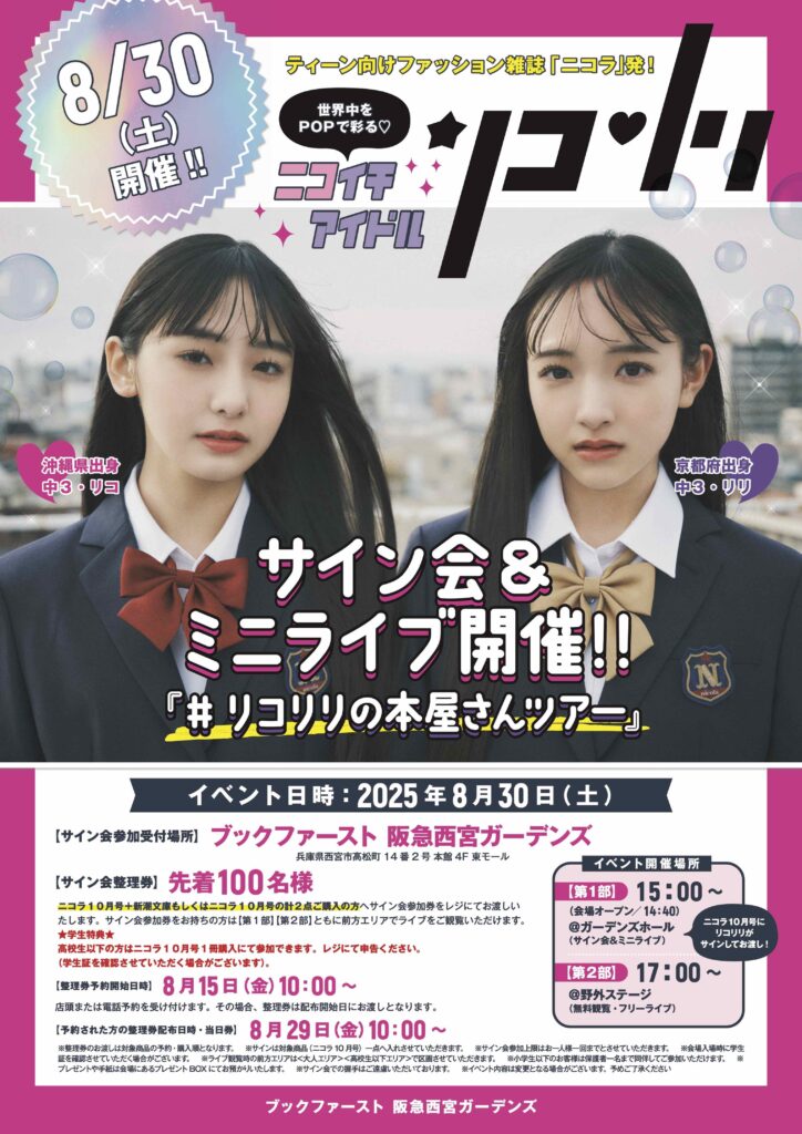 ニコラ発のアイドルユニット「リコリリ」初となる関西イベントの開催が決定!「リコリリの本屋さんツアー」と題し、全国の書店を周ります!ニコラへのサイン会に、もちろんリコリリライブも!ニコラ10月号購入でサイン会に参加&ライブは前方エリアで見られるよ!今すぐ詳細をチェック!!関西ニコ読のみんな、8月最後の土日に遊びにきてね〜!!!!