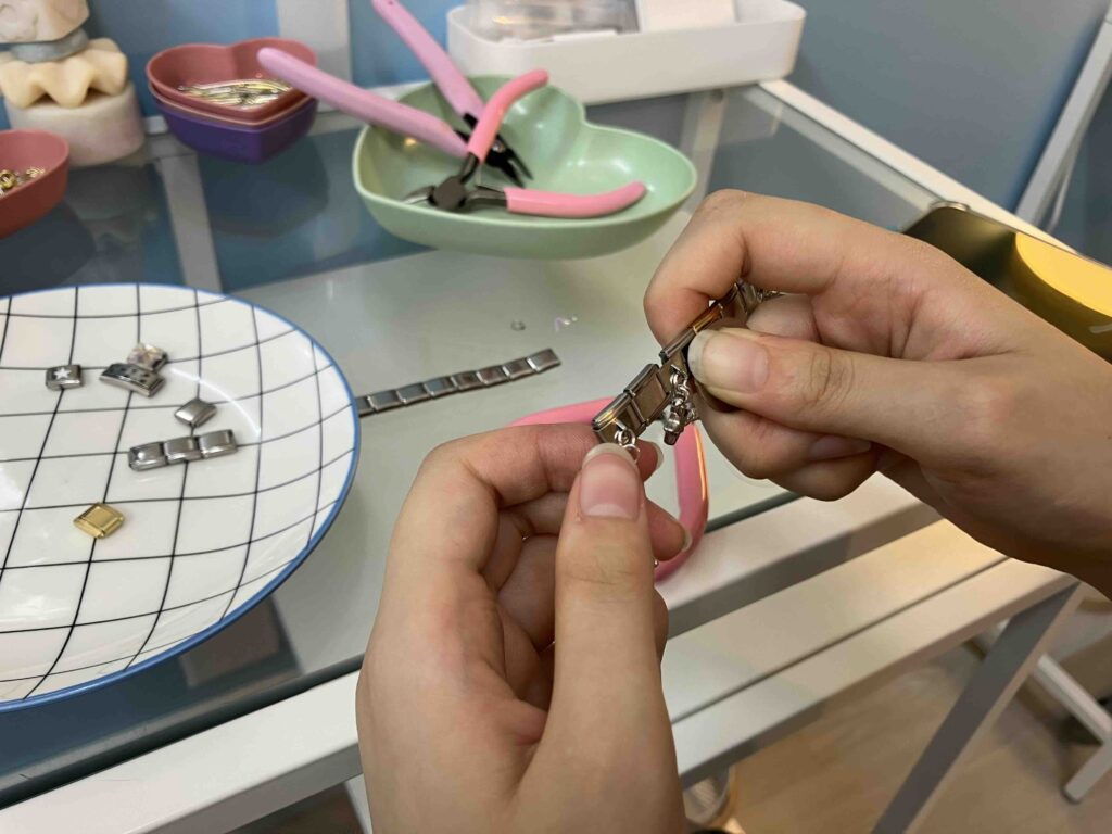 チャームをつなげる作業は、コツをつかめば超簡単!18〜19個のパーツをつなげてブレスレットを作るよ!