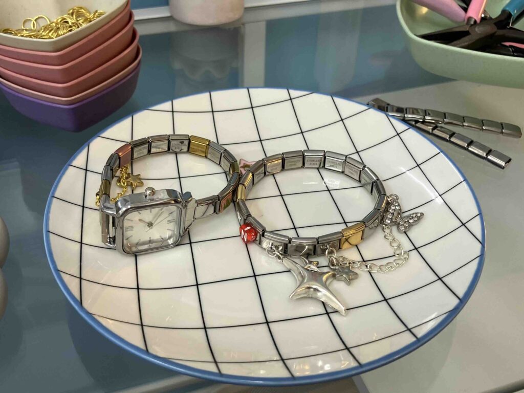 パーツをひとつずつ選んで作るイタリアンチャームブレスレット。立体的なモチーフがついたものからシンプルおしゃれなパーツまで、たくさんありすぎて迷っちゃう♩選ぶパーツの数によって値段が変わるよ!今回はつけ放題のコースで体験させていただきました♡さらに、+1000円で時計をつけることもできちゃうんです!時計の種類もたくさんあって、選ぶ時間が楽しすぎる!