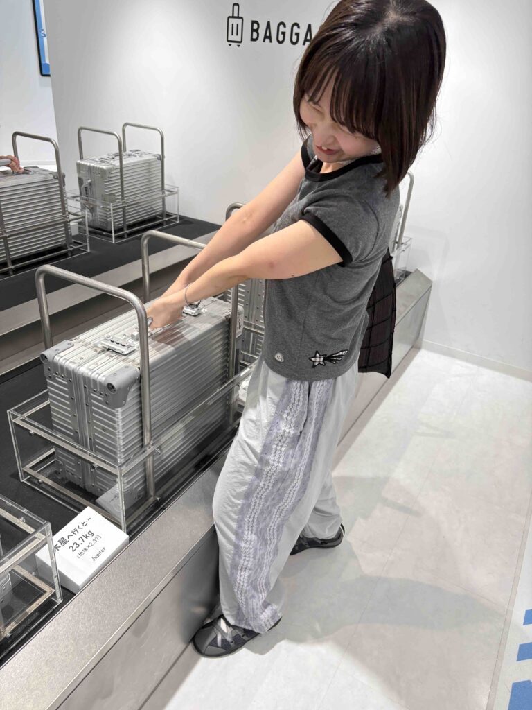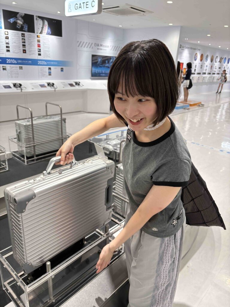 地球とは重力がちがう天体に10kgのスーツケースを持っていくと、どのくらいの重さになるのかを実体験できるよ!地球より重力が重い木星はなんと23.7kgに!実際に持ってみると持てないほど重かったよ。