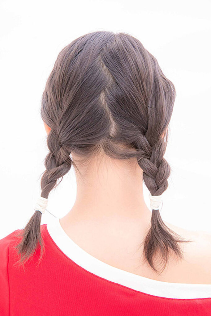 2.顔まわりの毛は少なめに残して、左右それぞれ低めの位置でみつあみを編む。