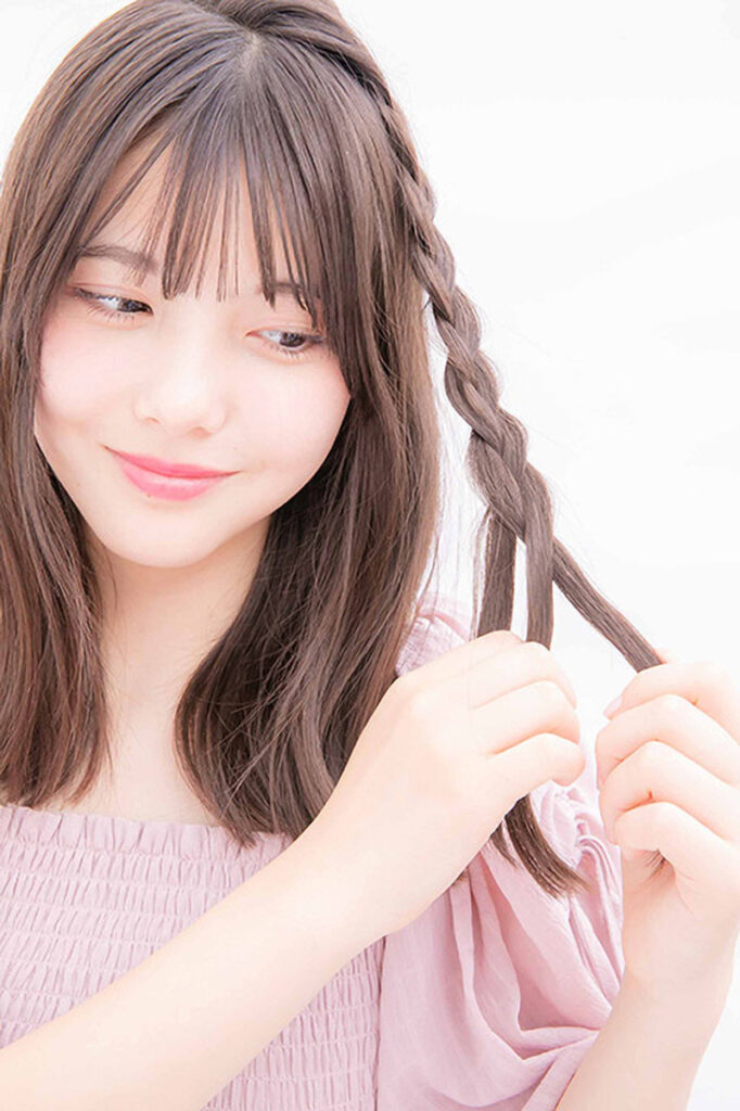 2.取った毛束をみつあみにしてゴムで留める。好みでレースのリボンをつけて♡