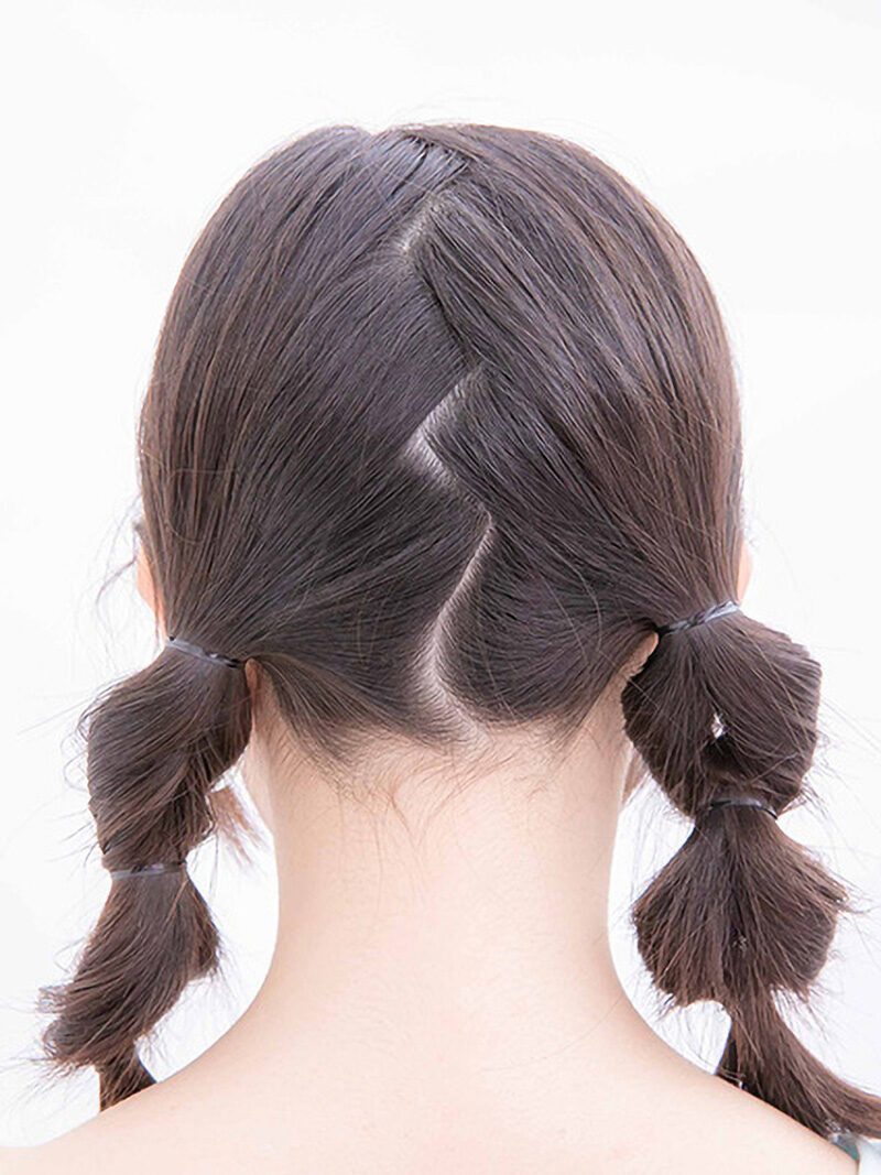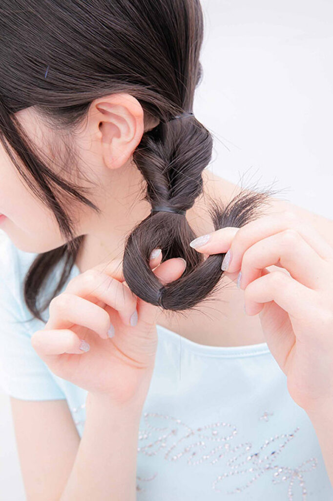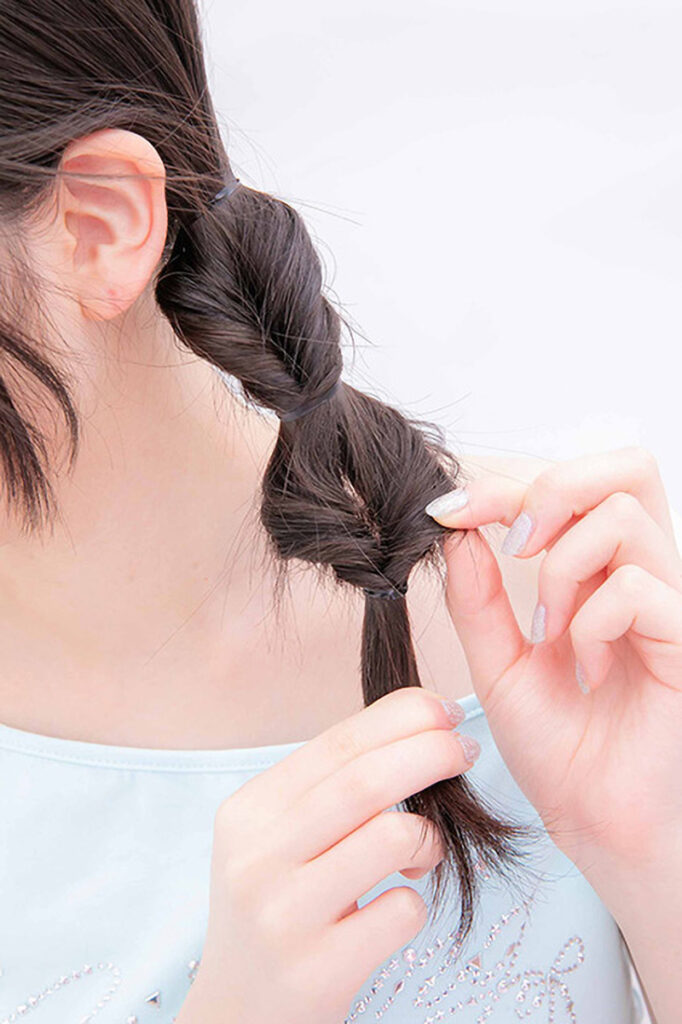 2.それぞれ耳下で結んだら、くるりんぱを2つ作って。きつめに作るのがポイント。
