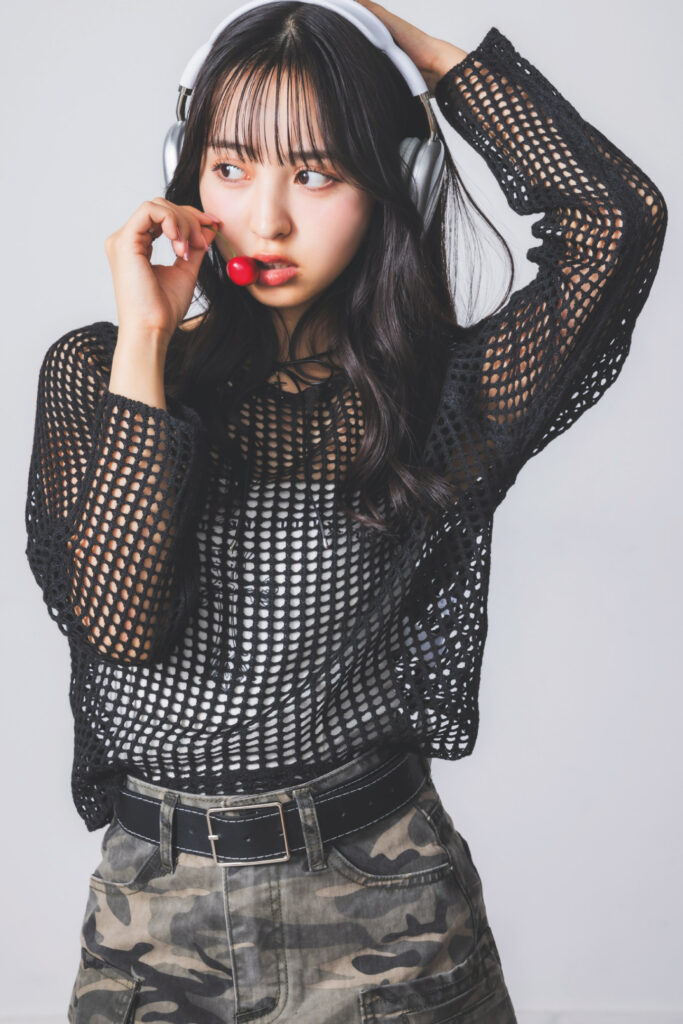 ミユウ★メッシュトップス(インナーキャミソールセット)¥1760、ベルトつきスカート¥3190/ともに高速ターミナル 原宿店 中に着たロゴベアトップス¥2970/me+em select チョーカー¥1100、レースアップリング¥660/ともにパリスキッズ 原宿本店