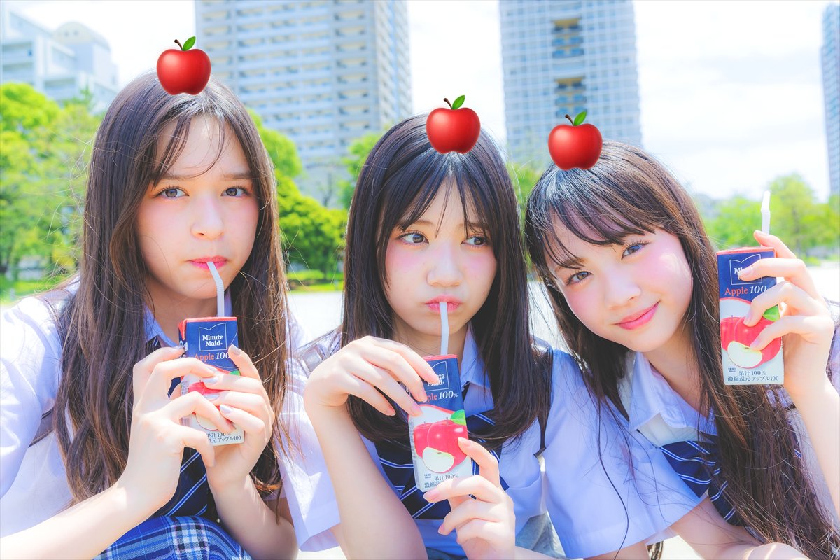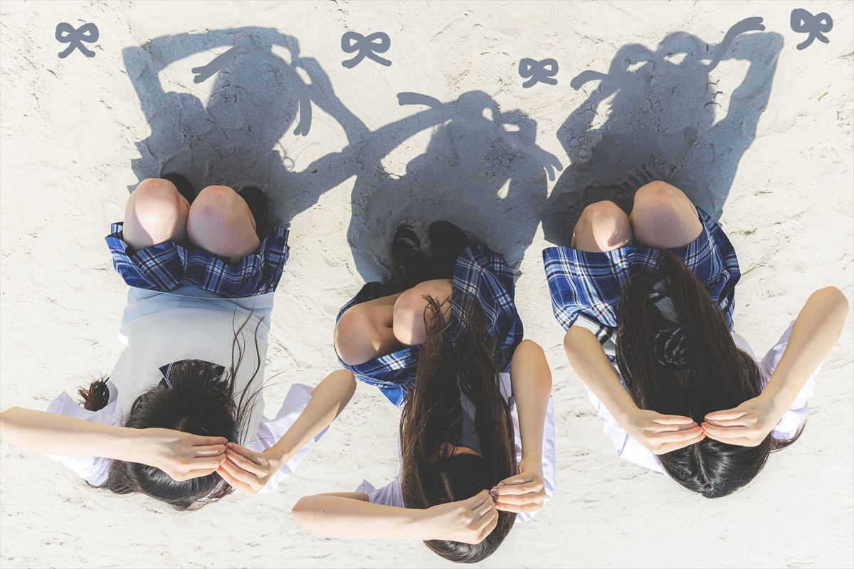 少しつぶしたハートを頭の上に持ってくればリボンの完成!左右に垂れる紐の部分や周りにリボンモチーフを散らせば、ガーリーな1枚に仕上がるよ。3人おそろのデカリボンなのが可愛いっ♡