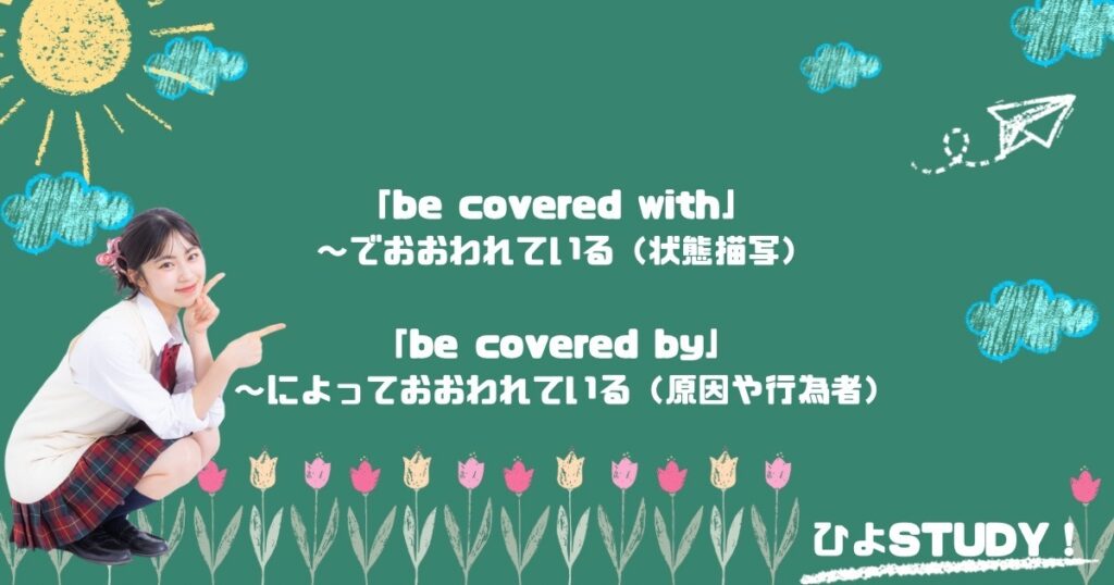 be covered by ~は「~によって覆われている」という意味。byは「覆った主体・行為者・原因」を表します。