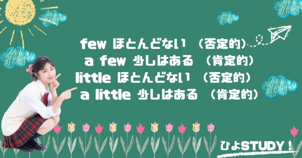 | few | ほとんどない | 数がとても少なく、否定的 |