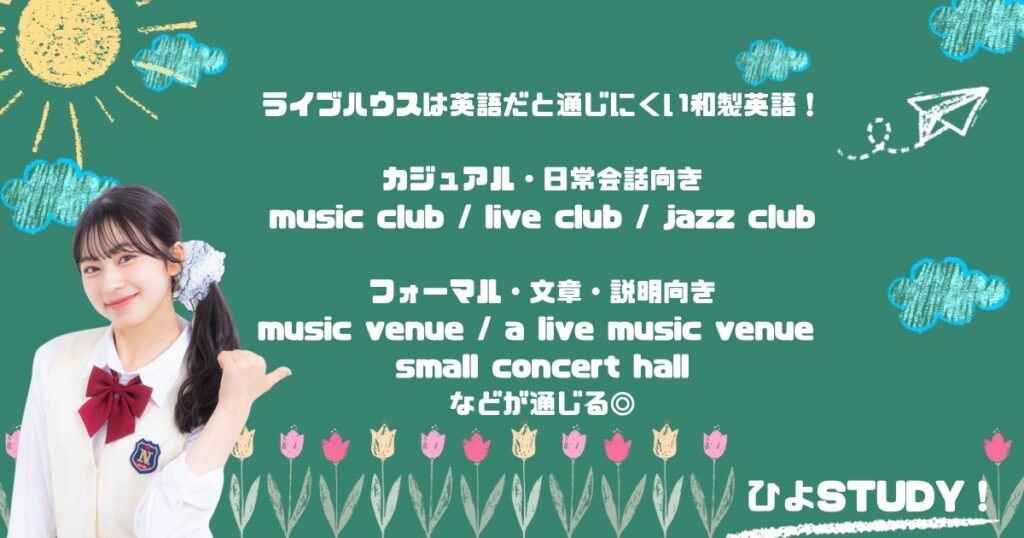 | カジュアル/日常会話向き | music club / live club / jazz club | 小規模ライブハウスやクラブ系のライブに使える。ネイティブにも自然に伝わる。 |
