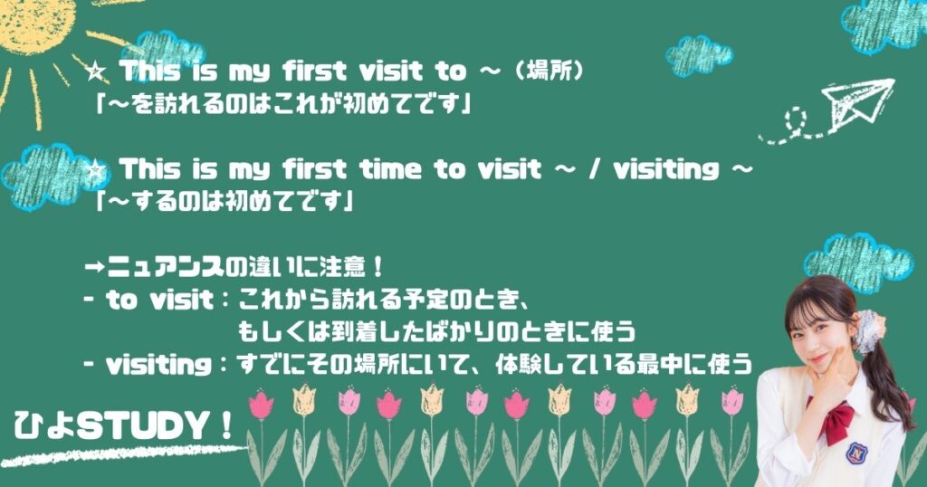 「〜を訪れるのはこれが初めてです」という基本フレーズ。この場合の visit は名詞で、「訪問」という意味で使われるよ!