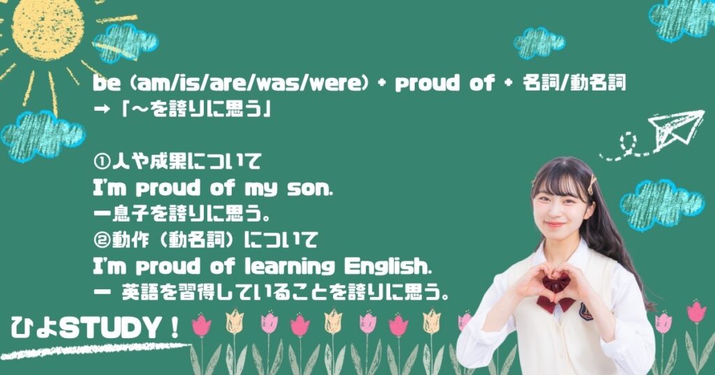 proudは「誇り」という意味の名詞。「be (am/is/are/was/were) + proud of + 名詞/動名詞」で「~を誇りに思う」を意味し、自分自身や他人の成果、行動、所有物などに対して、誇りを感じることを表すよ。