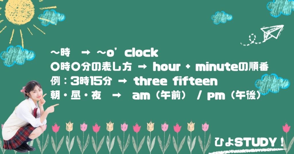 基本的には~時➡~o’clock と表すよ。「o’clock」は正時(~時ぴったり)のニュアンスなので注意!