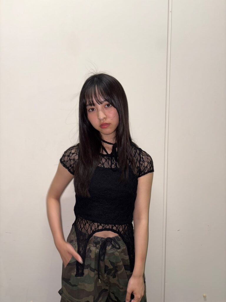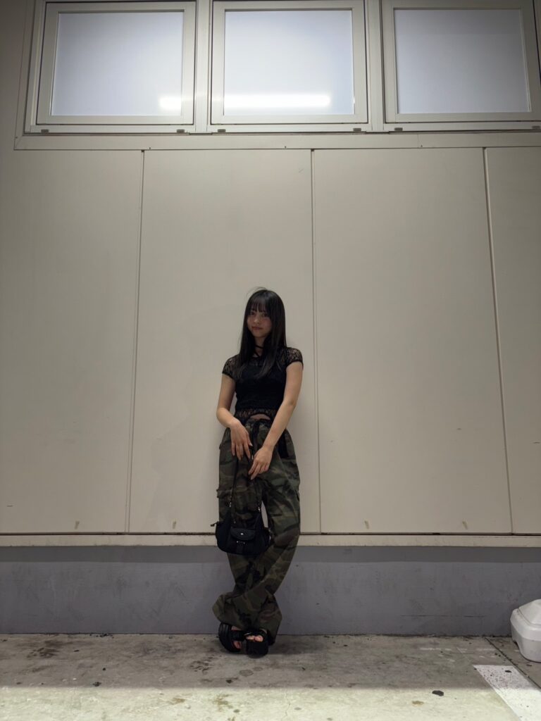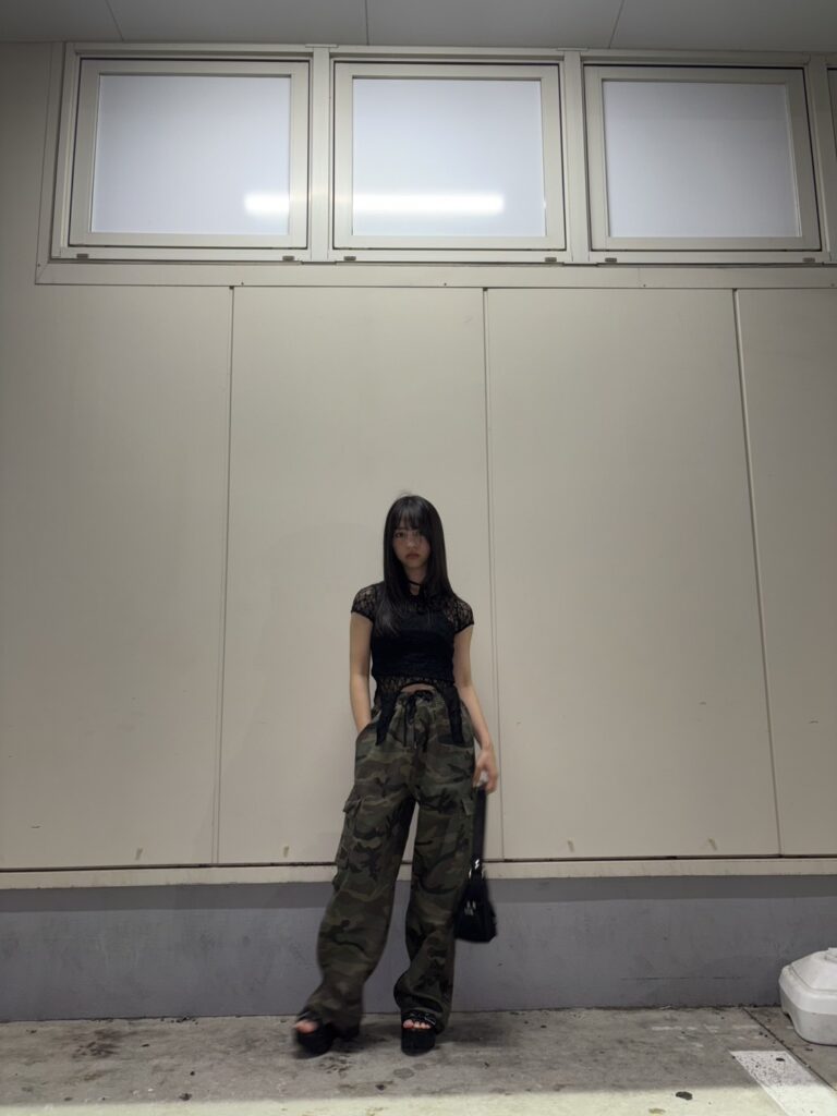 レースのトップスに強めのパンツを合わせれば絶妙なバランスの甘辛コーデが完成!迷彩柄を取り入れるだけで、ストリート感とアクセントが加わっておしゃれ度が倍増!いつものコーデに変化をつけたいときにおすすめだよ!これぞ憧れのクールJKスタイル★よっ、松田姫!