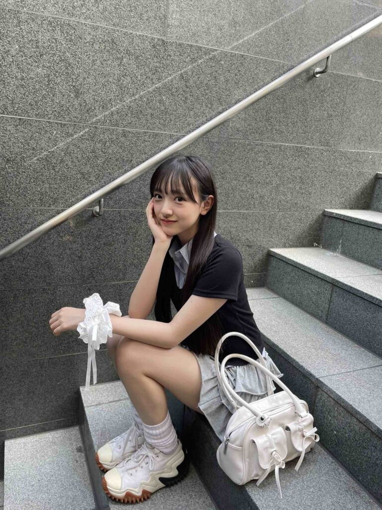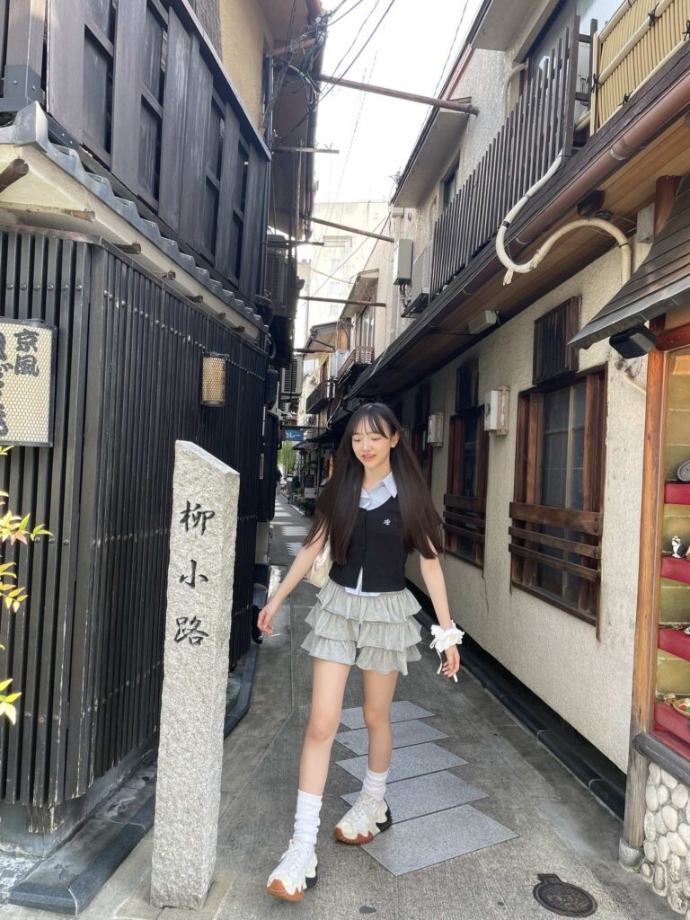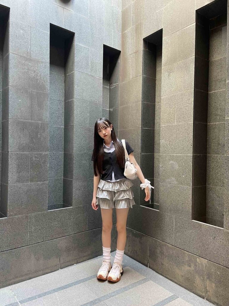 全体的に少し落ち着きのあるカラーだけど、スカートのフリルと手首のシュシュでおしゃ見え♪トップスはドッキングになっているから1枚着るだけでおしゃれが完成するよ♪落ち着いた印象だけど、清潔感のある白を要所要所で取り入れてガーリーな雰囲気もキープ❤︎韓国オンニっぽいこういうスタイルがリリの定番やで♪