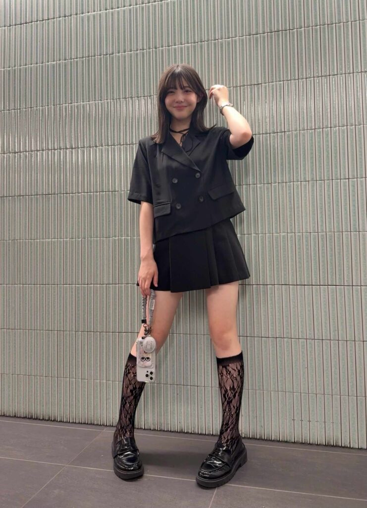ちょっと透け感のあるジャケットを羽織った大人っぽコーデだよ!セットアップに見えるけど、実は別のブランドのもの(笑)!黒で重たくなりがちだから、ソックスにレースをチョイスして抜け感を出したよ〜!絶妙に盛れて脚長効果のあるローファーは、みんなの味方、ユニクロです❤︎小物まで気を遣ってるのが大人かなって思うから、腕時計もしてみたよ!