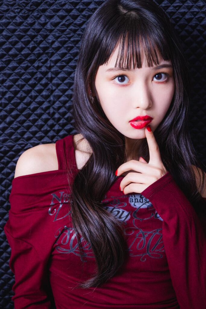 ヒナノ×EX-2 悪魔の快楽:とにかく発色がいい!派手な赤なんだけど、ツヤのおかげで透明感があるからつけやすいと思うよ。コーデはあえてカジュアル系にして、リップをガンガン目立たせたいな♪