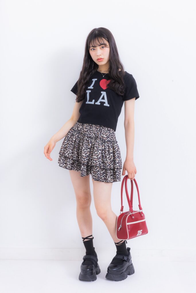 ヒヨリ「今流行りのI♡Tシャツをメインに使ったところがポイント!Tシャツはラフな感じが出てしまうから、ヒョウ柄のミニスカートやリボンソックス、赤のバッグ&シルバーアクセで遊びを効かせました♡友達と遊ぶ時は映画館んいよく行くからその時着るコーデ!ポップコーンが似合う感じのカジュアルストリートにしました^^」