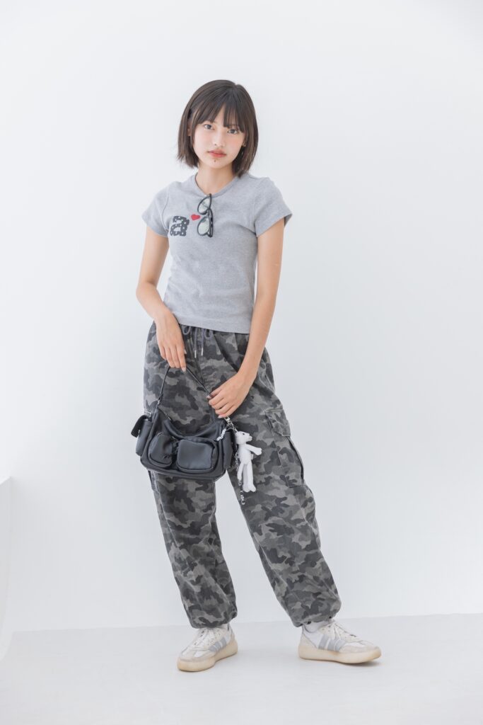 イブキ「韓国のaeaeというブランドのシャツがメイン!胸元のドットロゴがワンポイントになっているし、人と被らないデザインがお気に入り。グレーTシャツっておしゃれな韓国コーデっぽい!レピピの迷彩パンツはシルエットがおしゃれ。可愛いすぎず、カジュアルにしているところがポイントです」