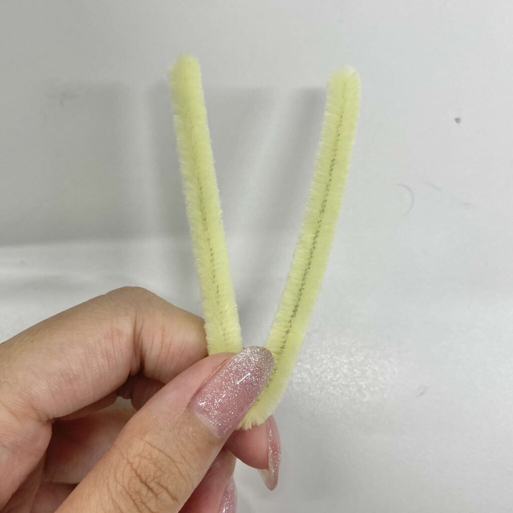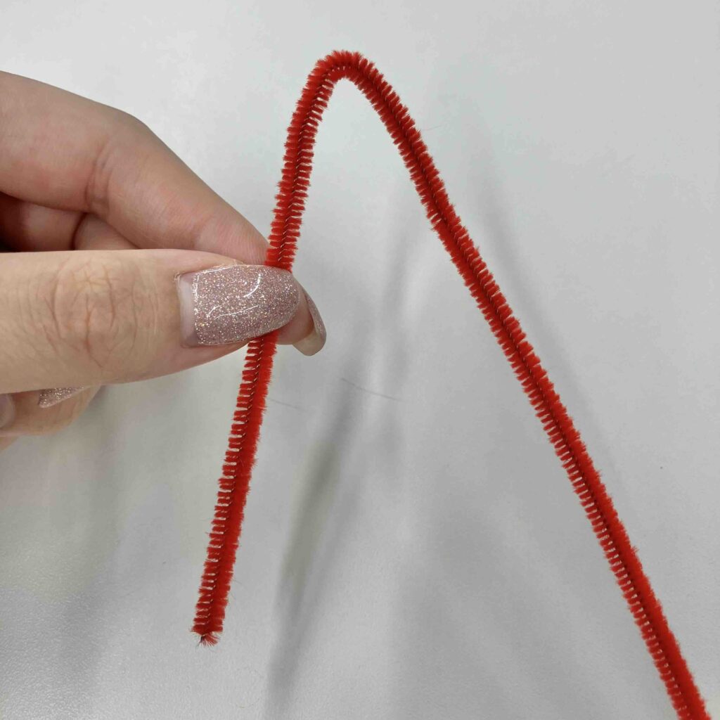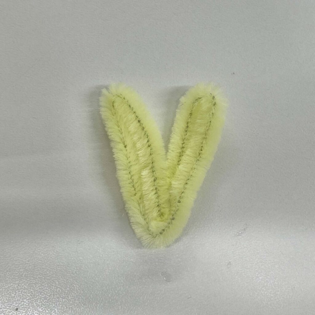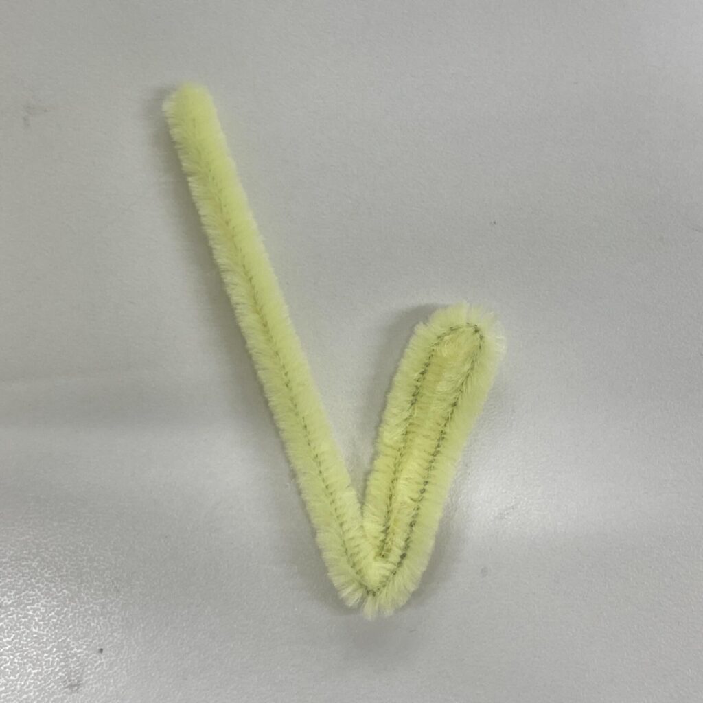 まず、モールを半分の長さに切る。約15cmになったモールを写真のように折り曲げ、「V」の形を作る。