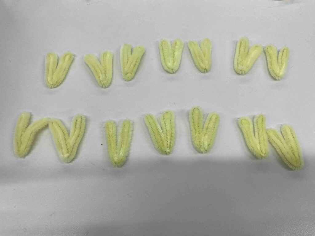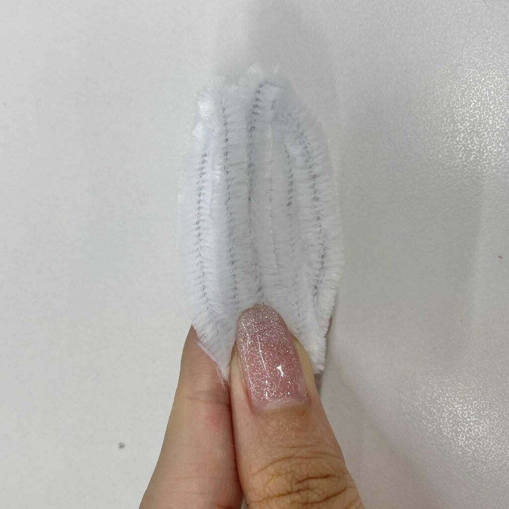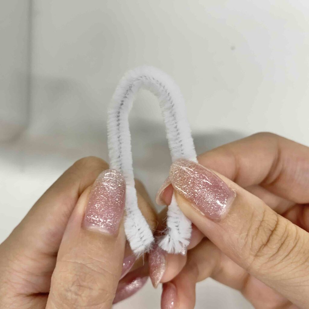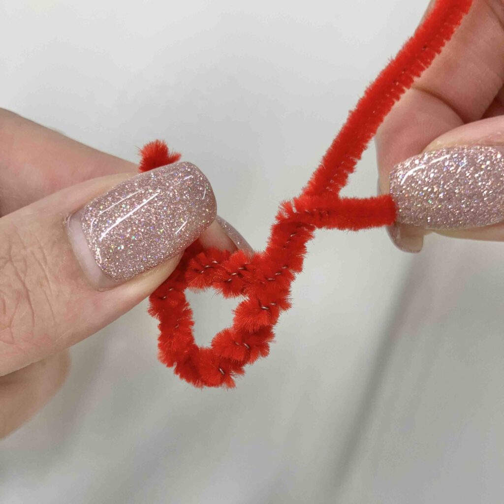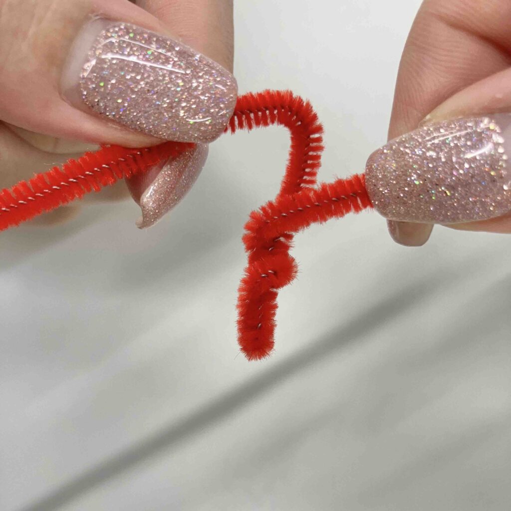 まず、モールを半分の長さに切る。約15cmになったモールを写真のように折り曲げ、「V」の形を作る。