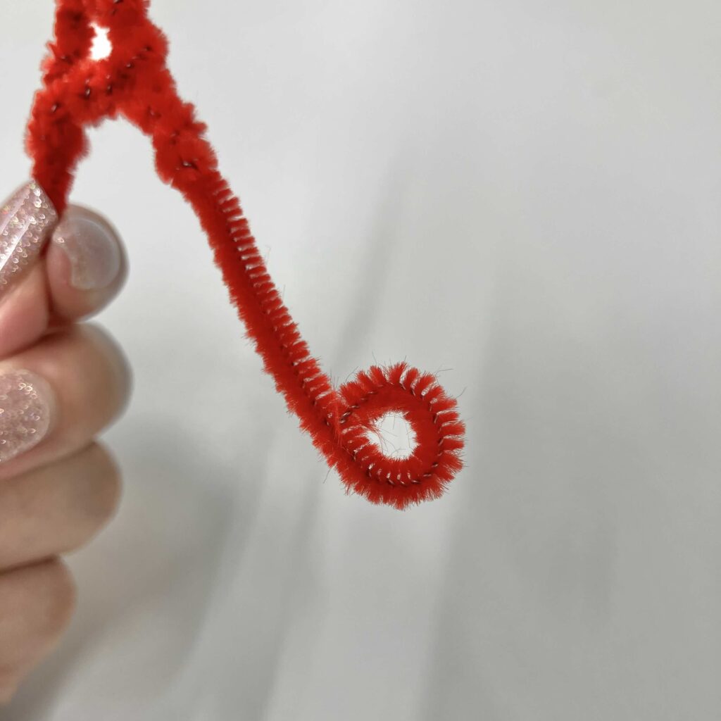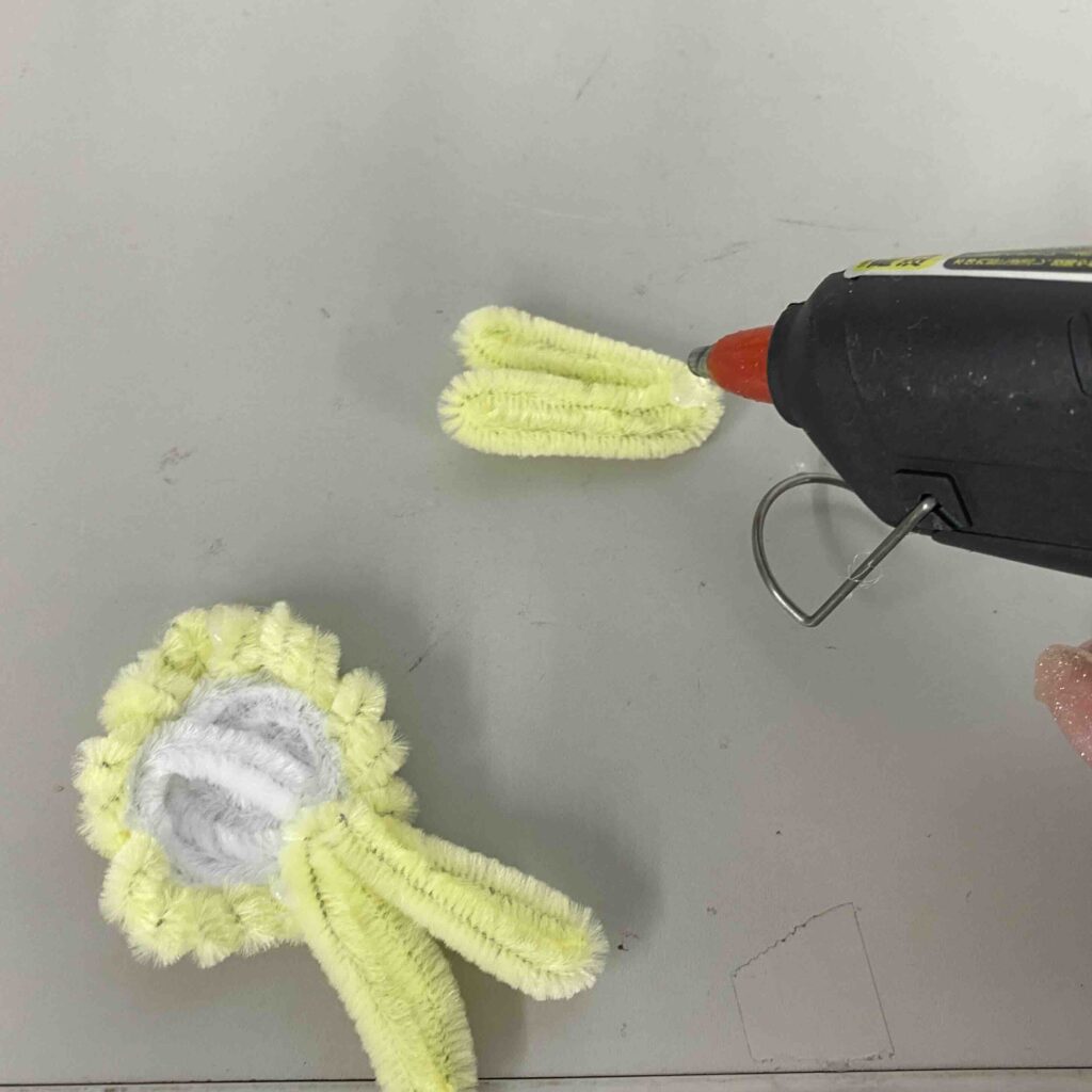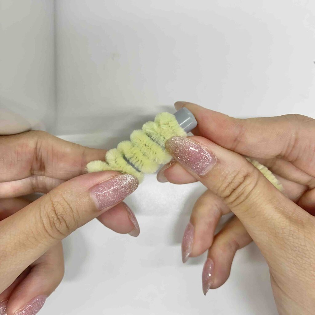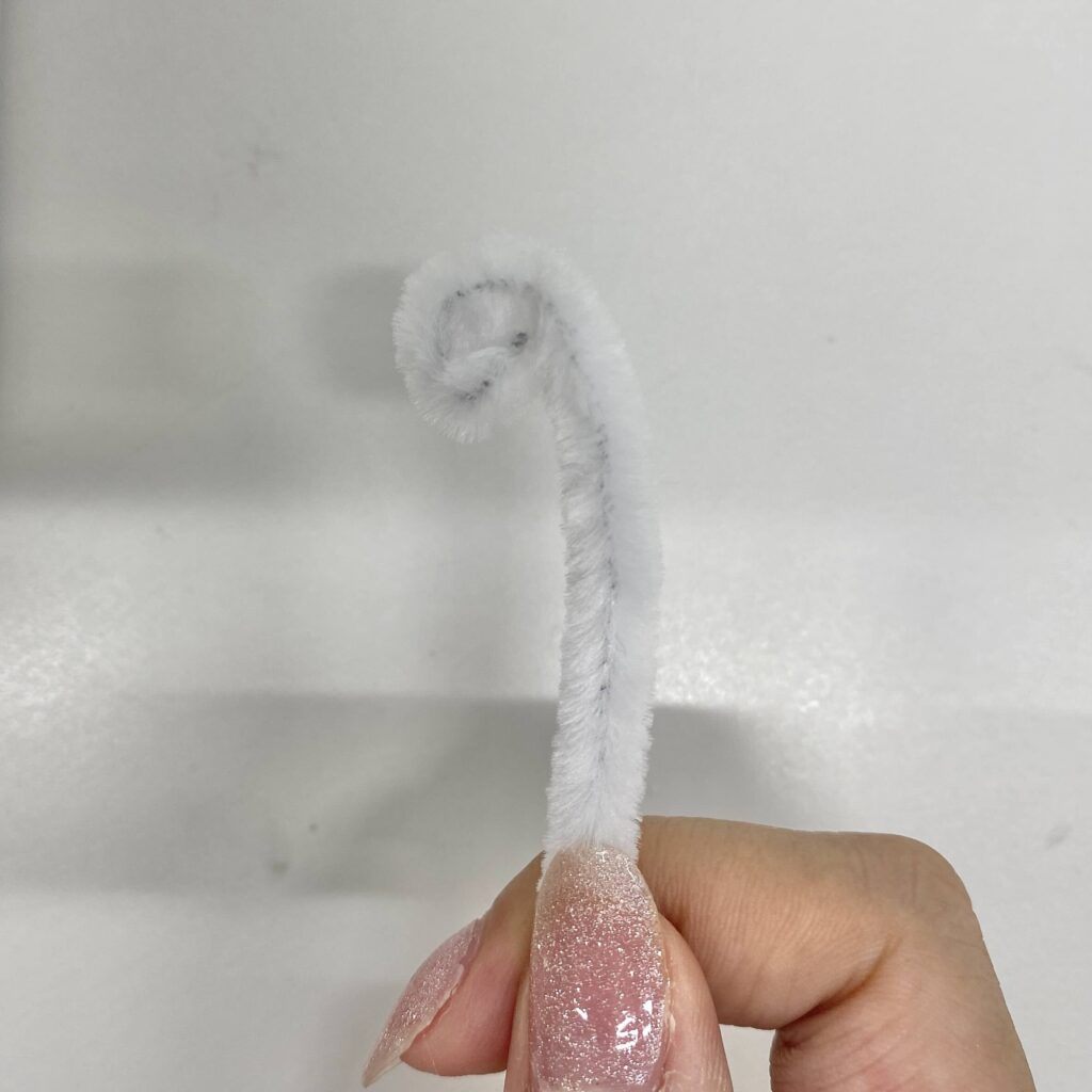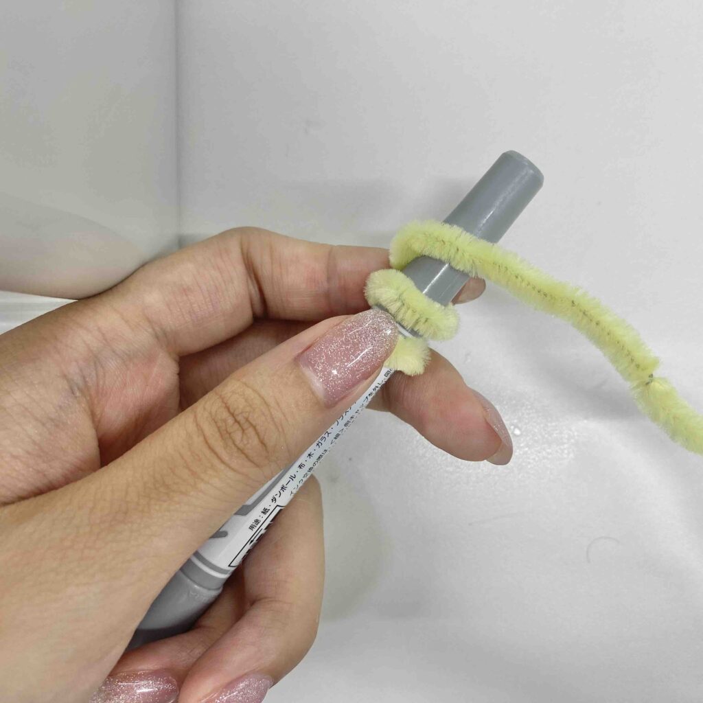 もう一本のモールは、ペンに巻きつけるようにしてくるくるにする!最後まで巻いたらペンから外し、先端にグルーガンをつけて輪の形にする。白のうずまきと合体させて、グルーガンでくっつけるよ!