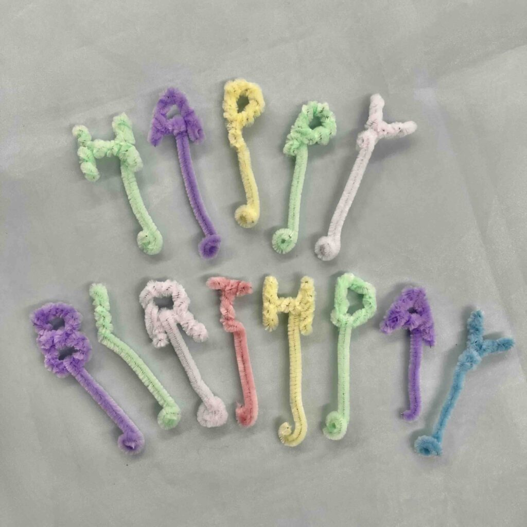 作り方は超簡単!まずモールを1/3〜1/4くらいの長さに折ってから、アルファベットの形を作る。作った線を戻るようにして、土台に巻きつけながら形を作っていくよ!正直どんな作り方でも最終的に形になればOK!(笑)