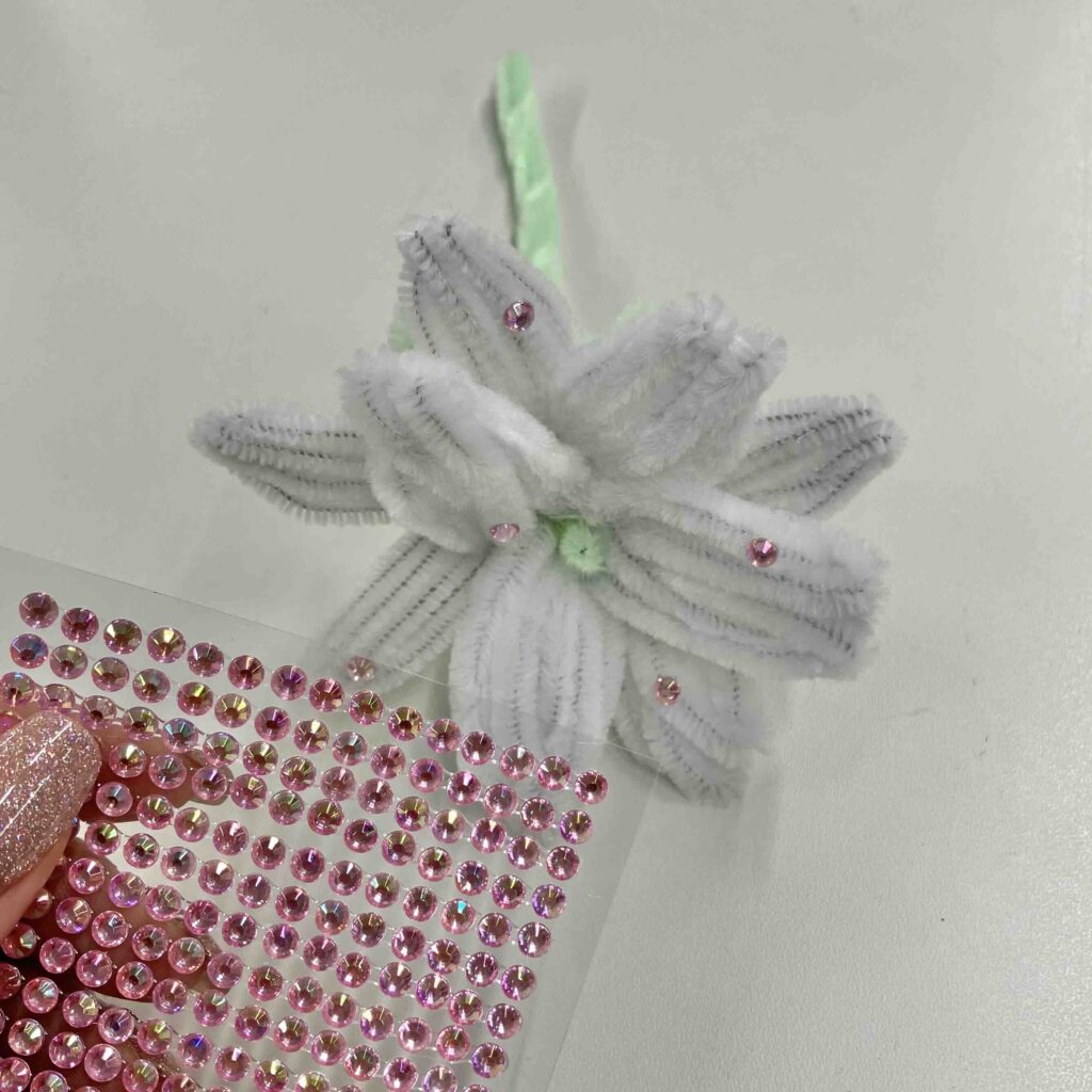 お花が完成したら、パールビーズやラインストーンでデコるよ!数個置くだけで大人っぽくてかわいい♡花びらのモールとモールの隙間にチェーンを通せば、キーホとして使えるよ!