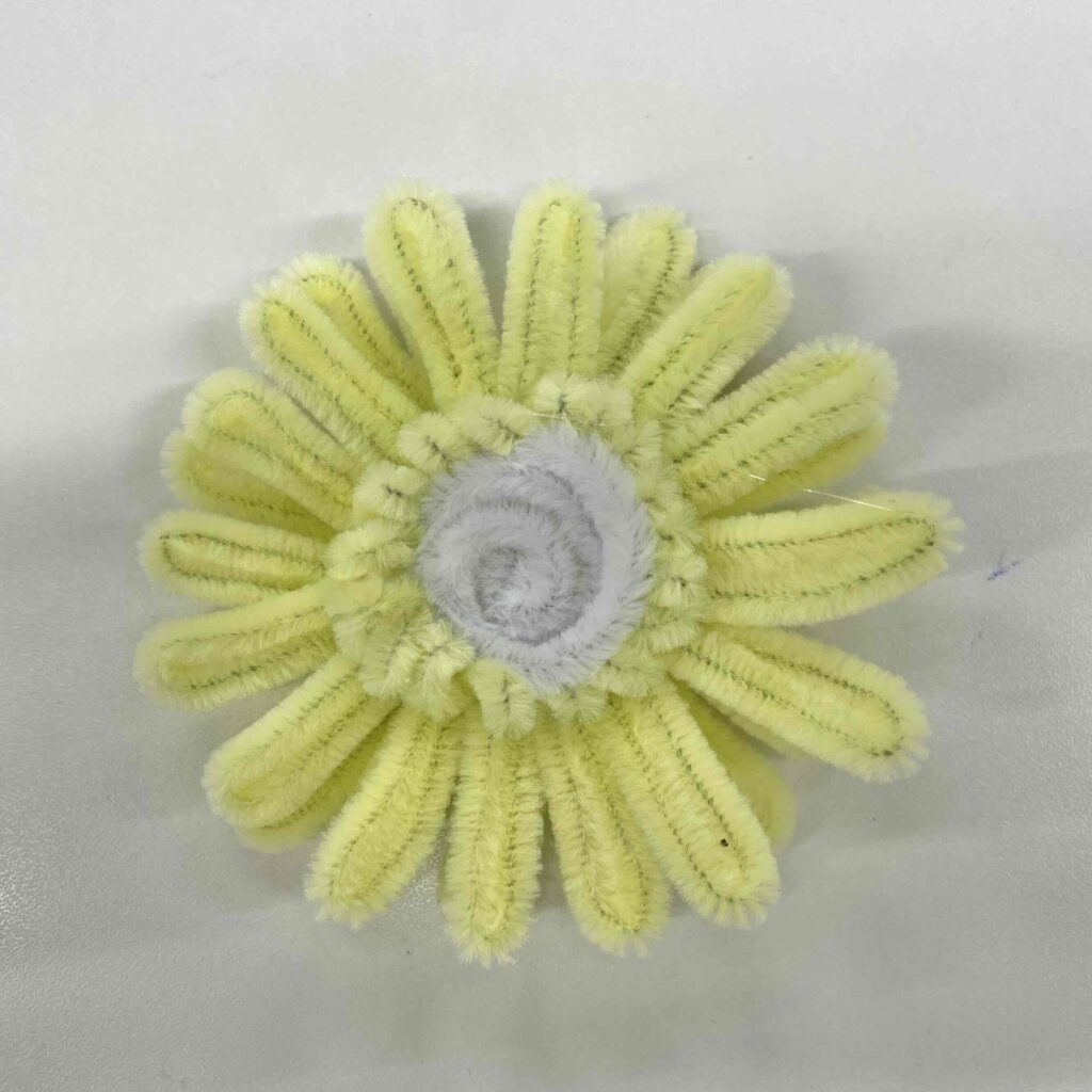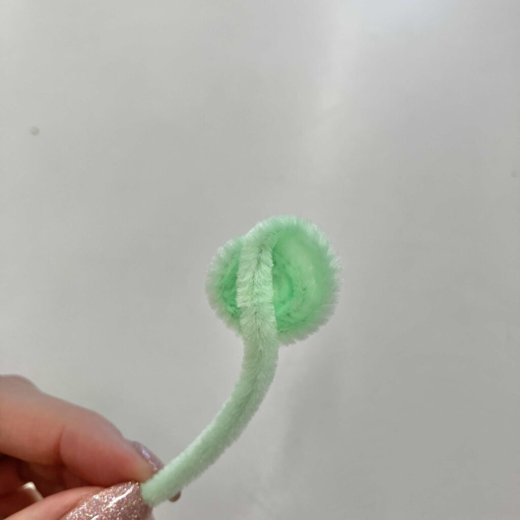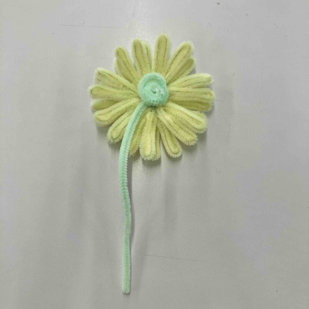 最後に緑のモールで茎を作るよ。モールの半分の長さをくるくると巻いて丸い土台を作ったら、そこにグルーガンをつけてお花とくっつける!花びらの多さがボリューミーでかわいいガーベラの完成♡