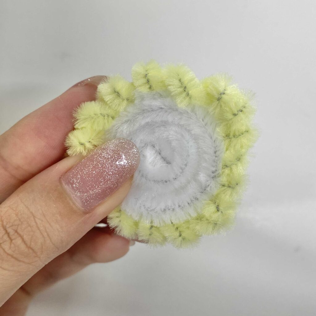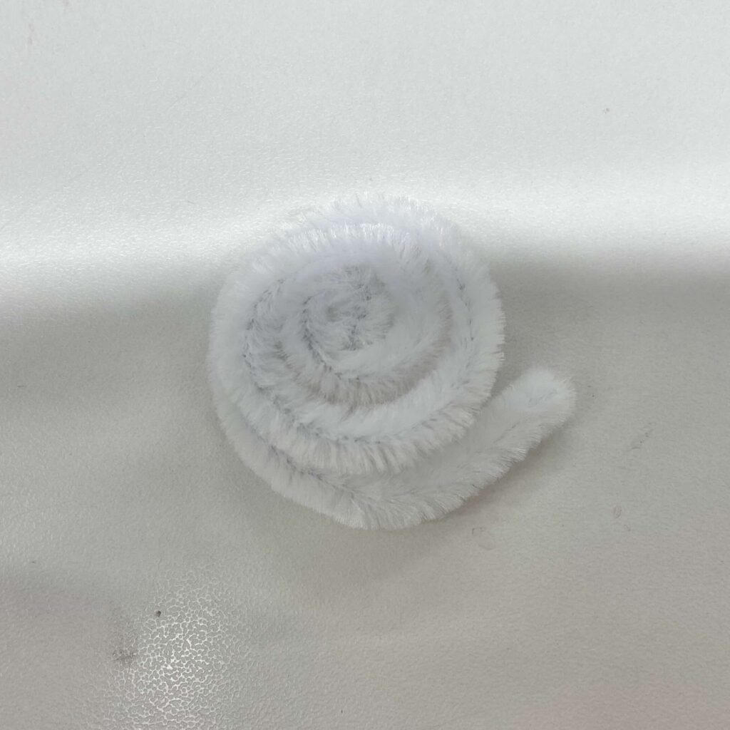 白のモールを先端から丸めて、平べったいうずまきを作る!