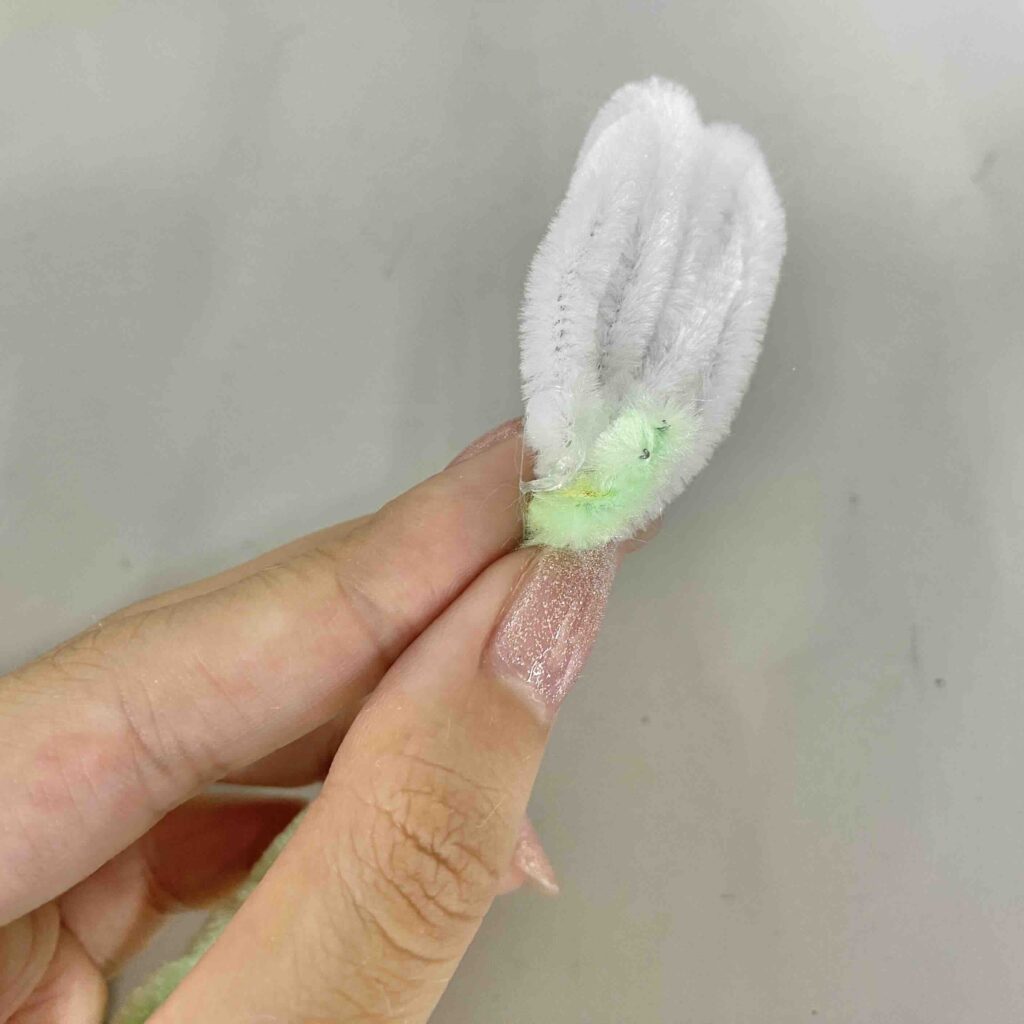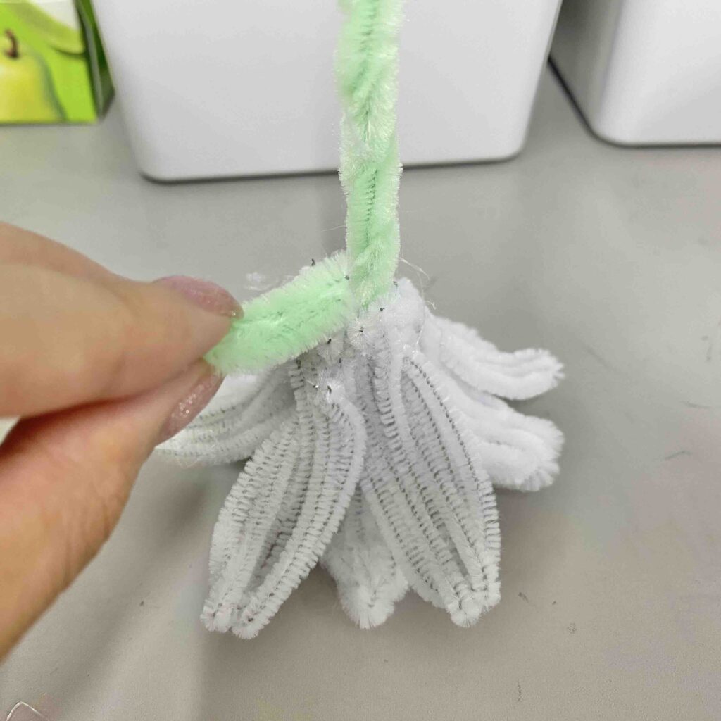 緑のモール1本を5等分の長さにしてからそれぞれ折り曲げて、細めの葉っぱを作る。2本目の緑のモールは半分に切って、そのうちの1本は半分に折る→ねじって茎を作る。グルーガンで茎に1枚ずつ花びらをつけて、最後に葉っぱもつけるよ。全てくっついたら、半分に切っておいた緑のモール(茎にしたモールの半分)を茎と花びらの接着部分に巻いて補強!グルーガンを使って固定してね。