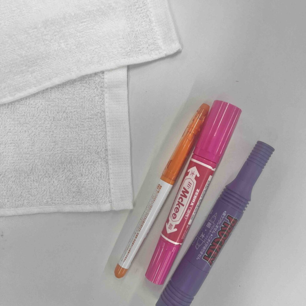 用意するもの:フェイスタオル、カラーペン(油性ペン推奨!)、フリクションのマーカー