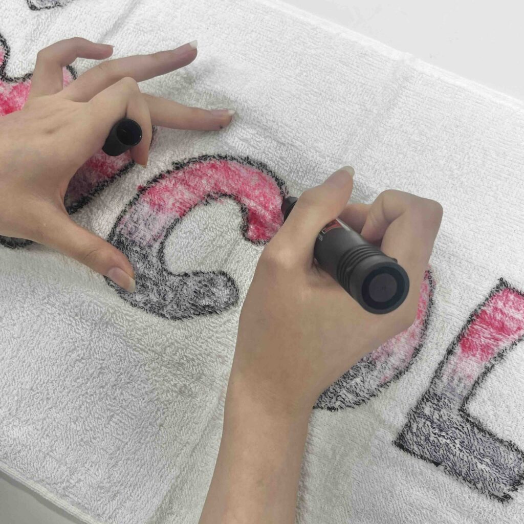 タオルは白だとより絵柄が映えるからおすすめ!まず、フリクションのマーカーで下書きをしていく!フリクションペンは熱でインクが消えるから、最後に残っちゃっても軽くアイロンをかければ消えるよ。