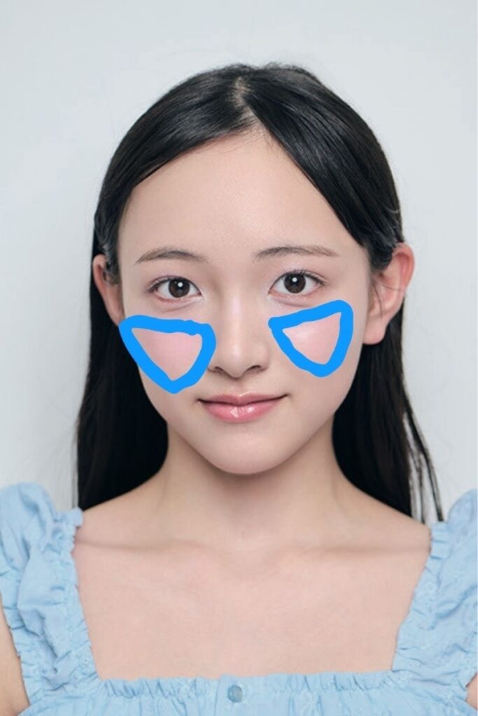 ③<チーク>青みパープルのチークを目の幅におさまるようにほお骨に沿ってつければ、血色薄い民に♡