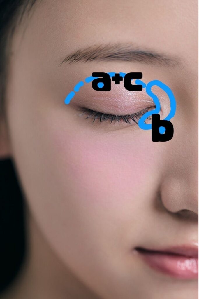 ① <上まぶた>アイホールにaピンクをぬり、cラメを重ねるよ。目頭をb偏光ラメでくの字にぬるとき、下ラインは涙袋の線に合わせて。