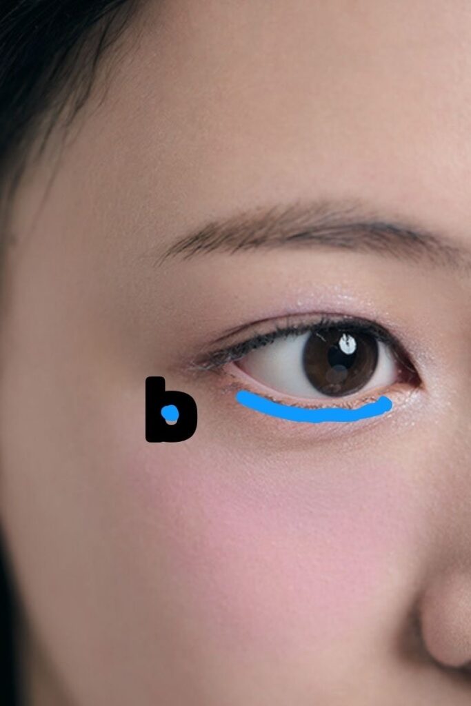 ② <下まぶた>粘膜カラーのペンシルアイライナーでまつ毛の間を埋めて、色素薄い印象にするよ。