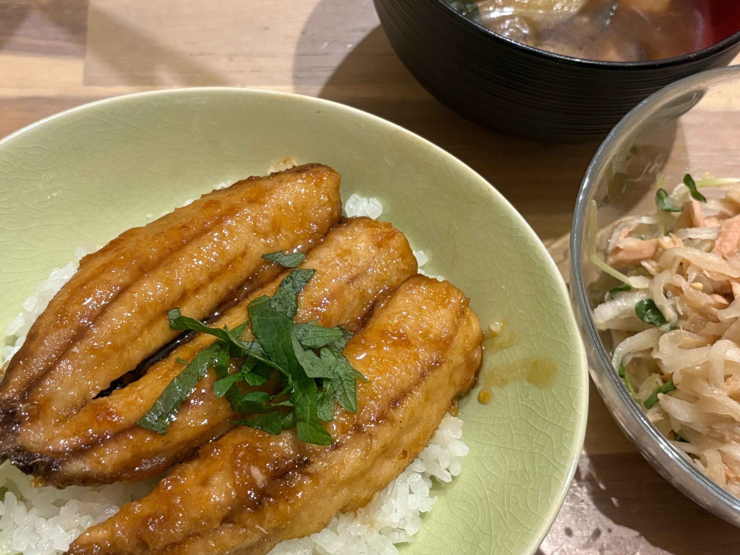 量は蒲焼き丼<大根サラダ。蒲焼きだけでも十分味があるので、タレは何滴かだけ!!