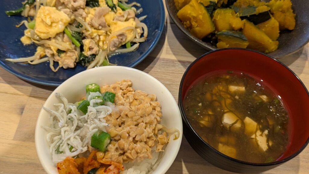 絶対に週一回は食べている納豆。特に納豆しらす、おくら、キムチ、胡麻の組み合わせがお気に入り。夜はお米を抑えた分をかぼちゃに置き換えると腹持ちが良くて満足感UP!!