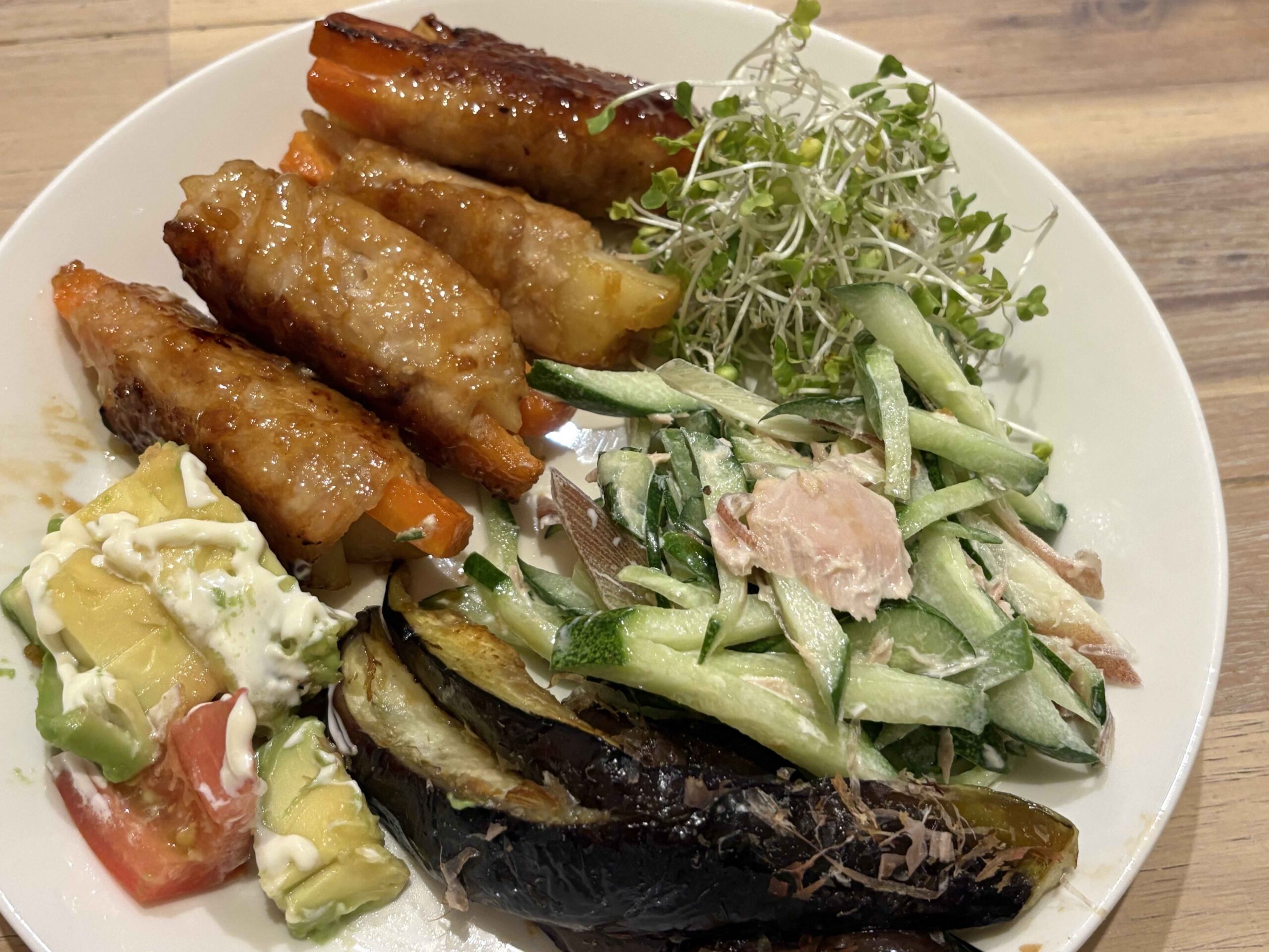 付け合わせのブロッコリースプラウトは栄養価が高い(しかも大好き)からよく食べてる!茄子は美容にいいオリーブオイルで焼いてます。ワンプレートにすることで、お皿いっぱいに詰まった感じがして、見た目に食べ応えがあります!サラダ類はおかわりすることも★
