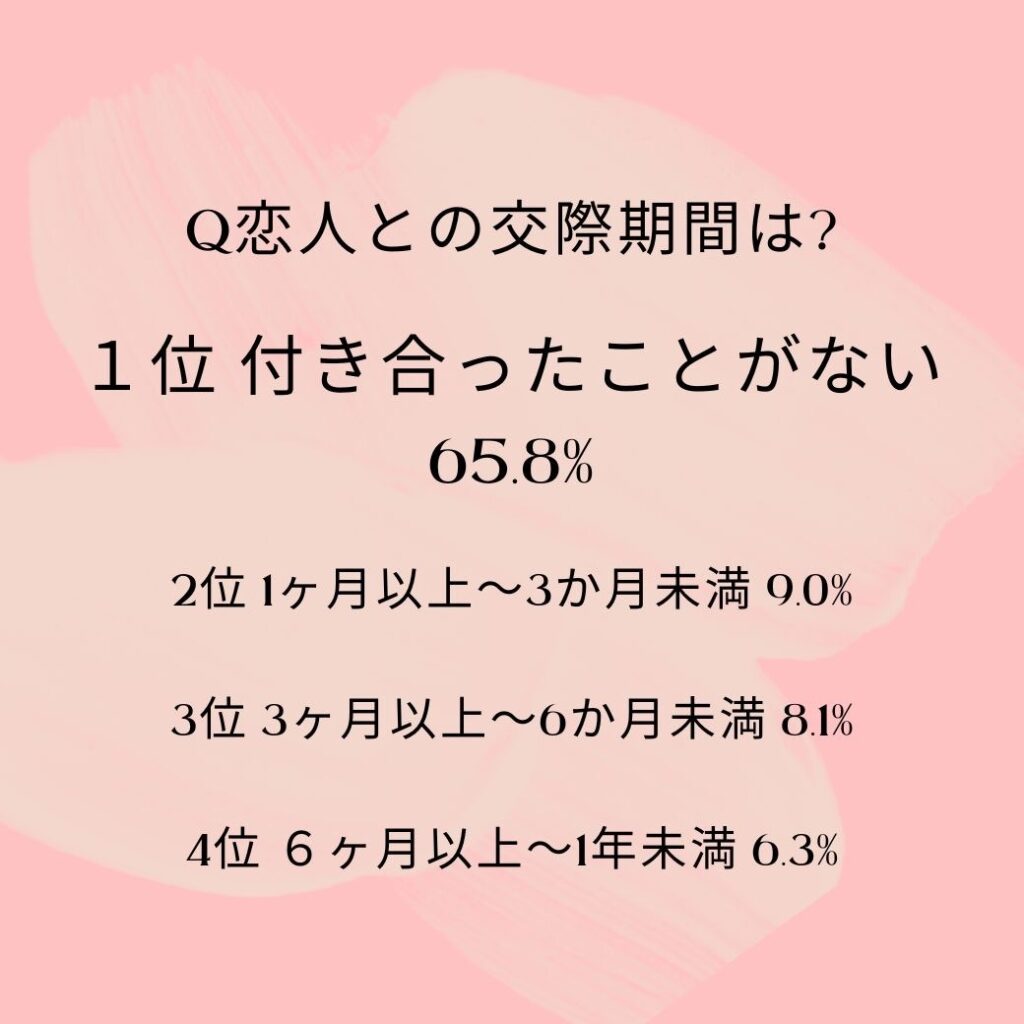 付き合った経験がある子の交際期間を見ると、1~3か月未満が9.0%、3~6か月未満が8.1%、6か月以上~1年未満が6.3%と、短期間の交際が多いみたい。一方で65.8%の子が「付き合ったことがない」と大多数を占める結果に。クラス替えや卒業など環境が変わる機会が多い中高生の恋愛は、”短い期間でギュッと青春する恋愛関係”が中心なのかも♡