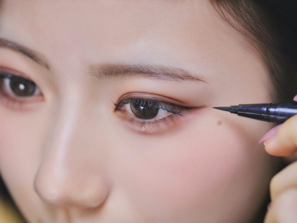 Fのアイラインを長め・跳ね上げでしっかりと描く。
