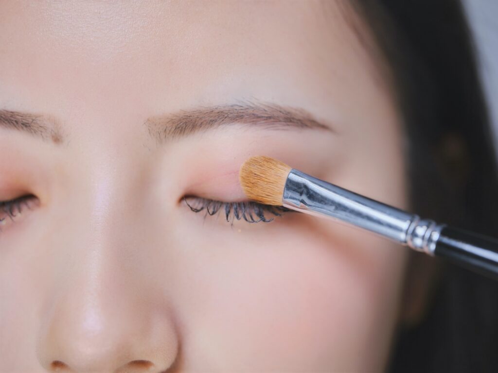 Bの上段左から2番目のカラーをアイホール全体にのせる。同じく上段右から2番目のカラーを二重幅に沿ってのせ、ピンクグラデまぶたに。下段右下の濃いブラウンを上まぶたのきわ、目尻1/3だけに細く書くようにのせ、締める。