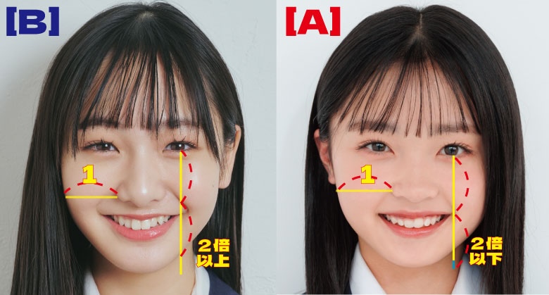 A.黒目の下から顎までの長さが、小鼻から輪郭までの長さの2倍以下