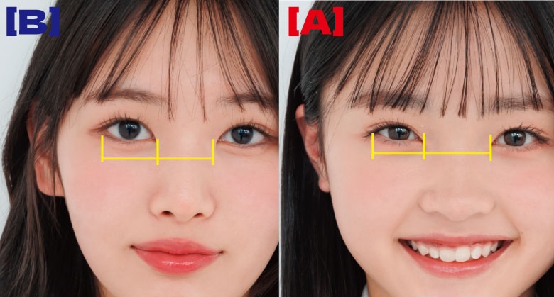 A.目と目の間の幅が、自分の目の横幅よりも広い