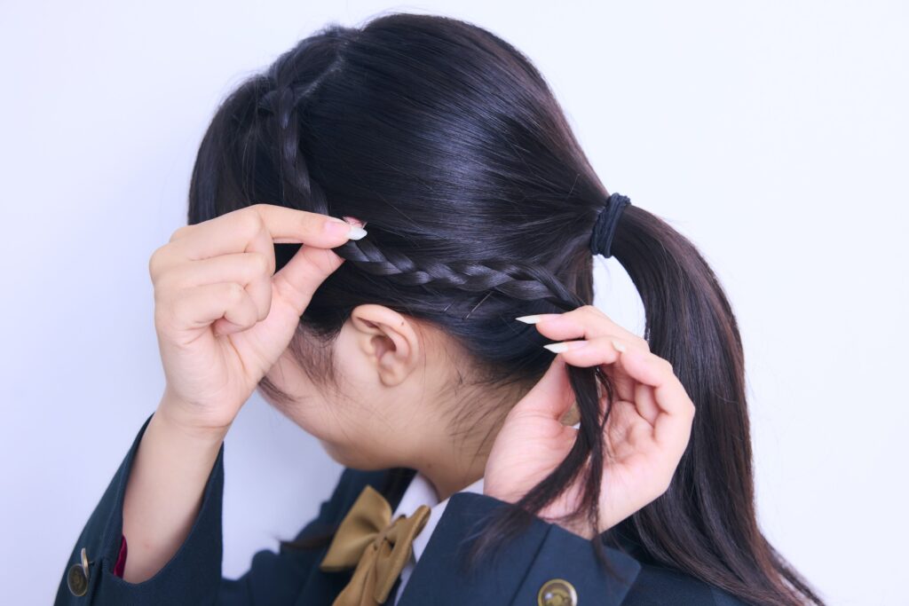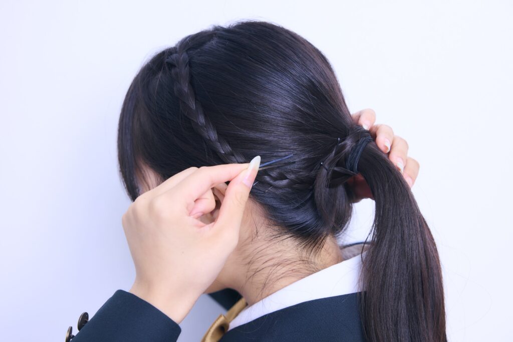 ②みつあみをポニーテールのゴムに巻き付け、アメピンで固定する。左右2ヶ所ずつ留めると崩れにくくなるよ!