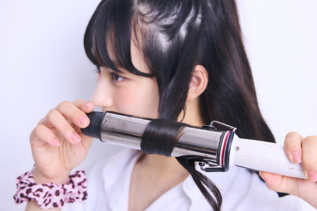①26mmのコテを縦にしてコロネのように強めに巻く。いくつかの束に分けて巻くときゅーと♡