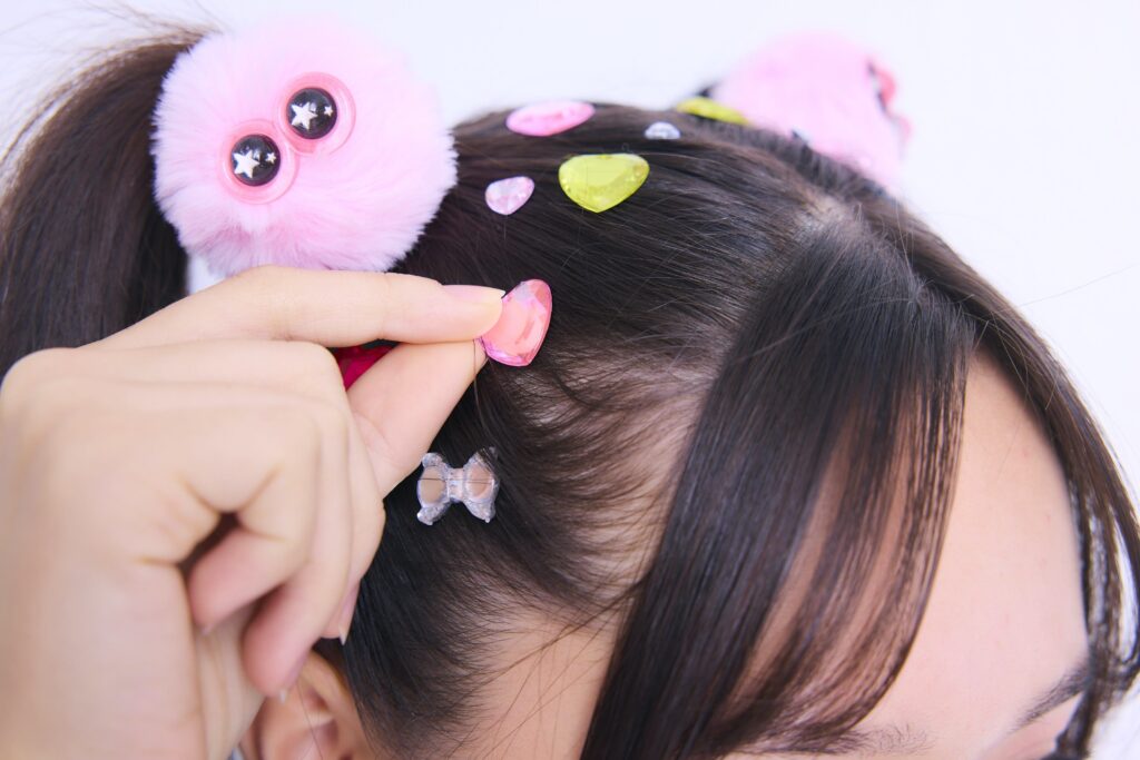②高めツインに結んだら、シールを貼る★こめかみ辺りは少なめに貼るとバランス◎。