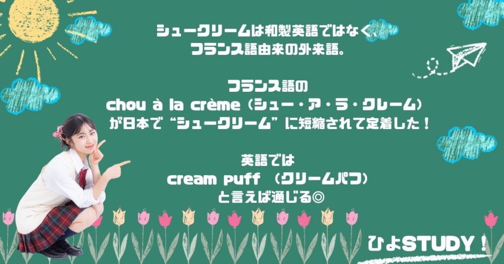 シュークリームは和製英語ではなく、フランス語由来の外来語。フランス語の chou à la crème(シュー・ア・ラ・クレーム) に由来しているよ。