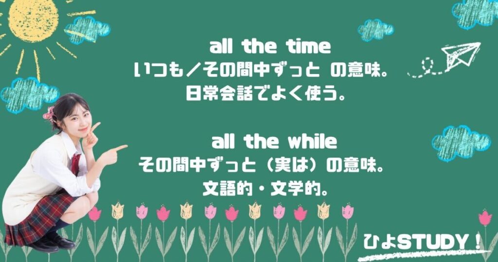 all the timeは日常でよく使われる表現、all the whileは文語的な表現なのでシーンで使い分けよう♪