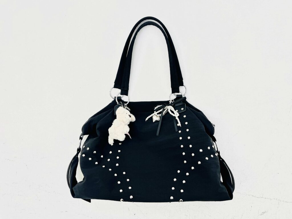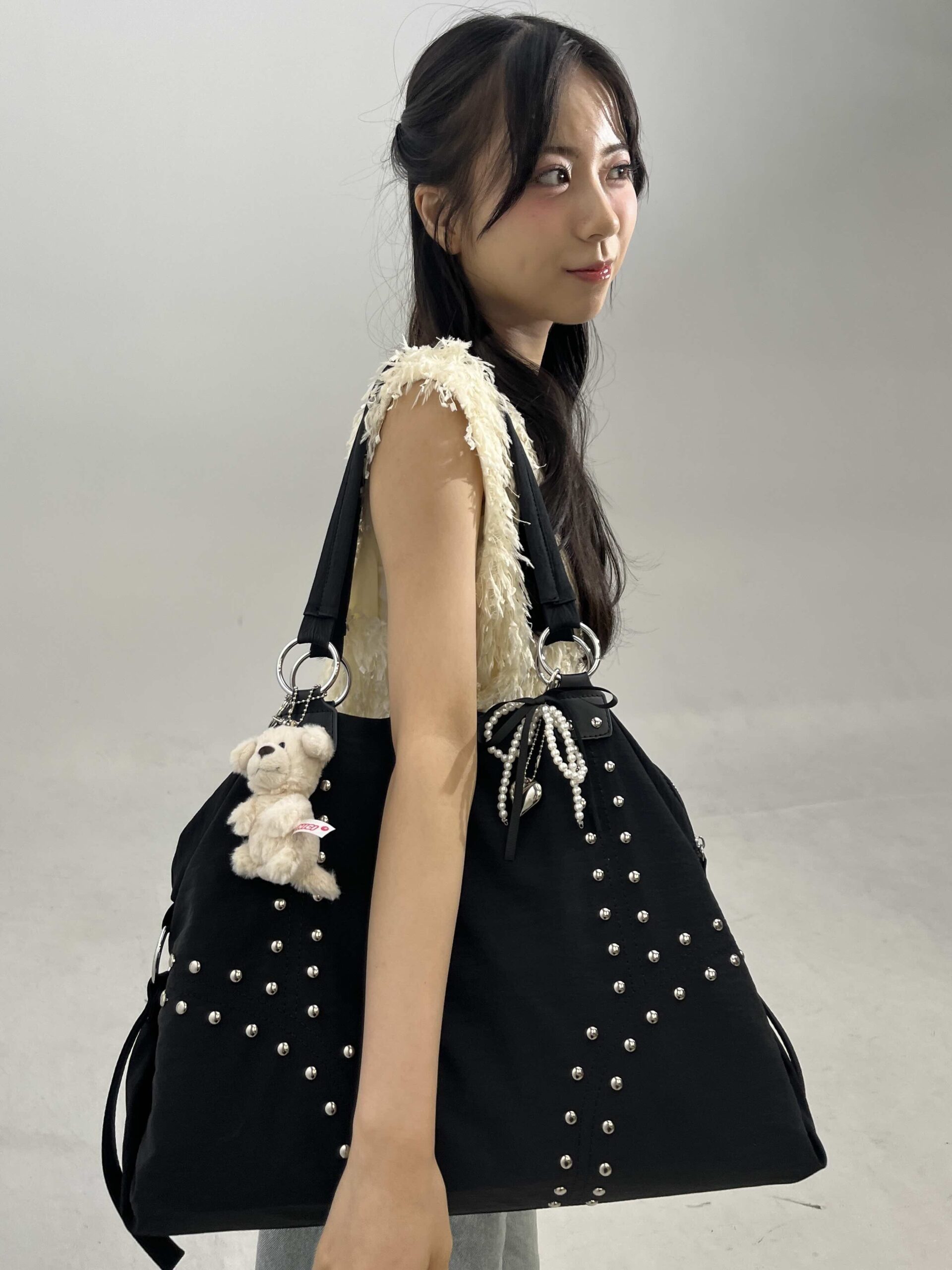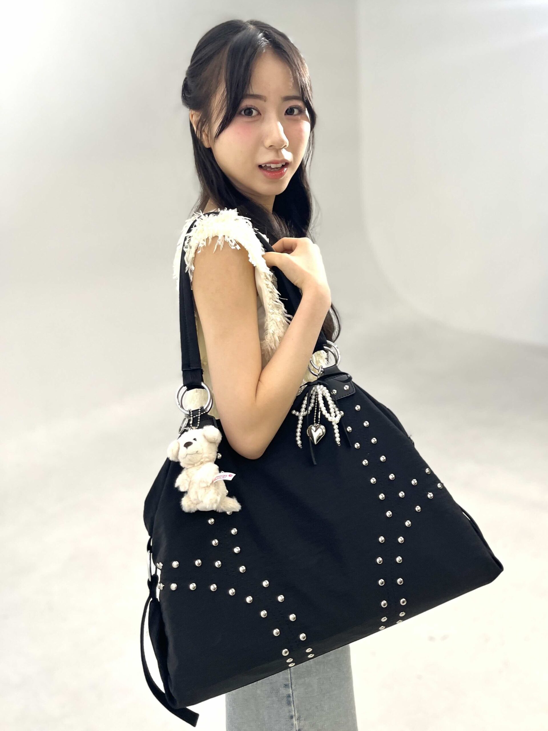 BARELY BLUEのバッグはZOZOTOWNのセールでお得にゲットしたんだって!スタッズのラインが目をひくちょいGALテイストのバッグに、甘めのチャームをつけてユアらしさも忘れないっ♡アイドルとしても活躍するユアはレッスン着にメイクポーチ、アイロンなどなど、たくさんの荷物を持ち歩くから、バックの大きさがマストポイント!「マチがあって収納力の高いバッグをずっと探していたんです!」とのことで、大満足のお買い物だったそう♡部活に、習い事に、遊びに、なにかと荷物が多くなっちゃう、超忙しニコ読のみんなも要チェックだ!!