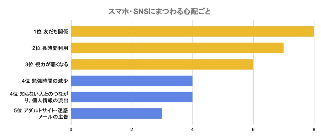 SNSを巡る心配は、スマホを持たせるうえでつきもの。中でも友達関係に関する心配事は1位になるほど多く、LINE上でのいじめ問題は学校でも多く話題に上がっているようでした。2位から4位は、スマホを長い時間使うことにまつわる心配、5位以下はSNS上での事件に巻き込まれたら……という不安の声が挙がっていました。